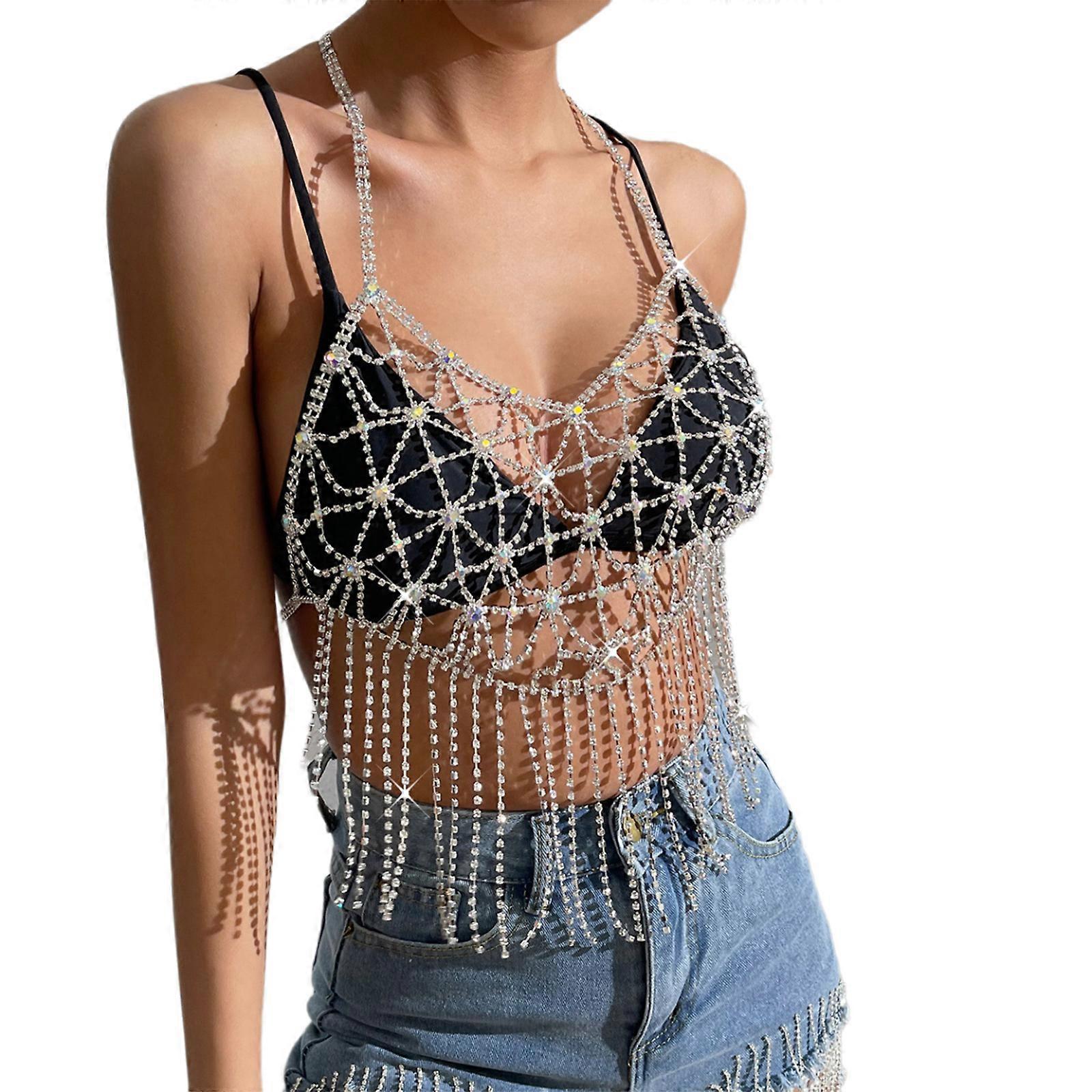 Women Sexy Halterneck Backless Bra Camisole Sparkly Rhinestones Tassels Chest Chain Body Jewelry Crop Top Party Outfit Multicolor