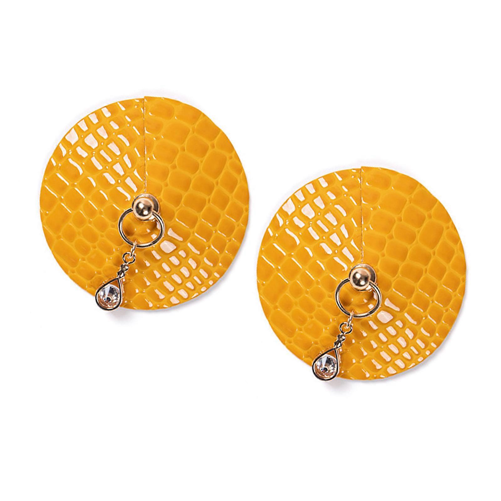 Women's Snakeskin PU Leather Nipple Covers Pasties with Rhinestones Pendant Carnivals Party Reusable Bra Petals Stickers Yellow