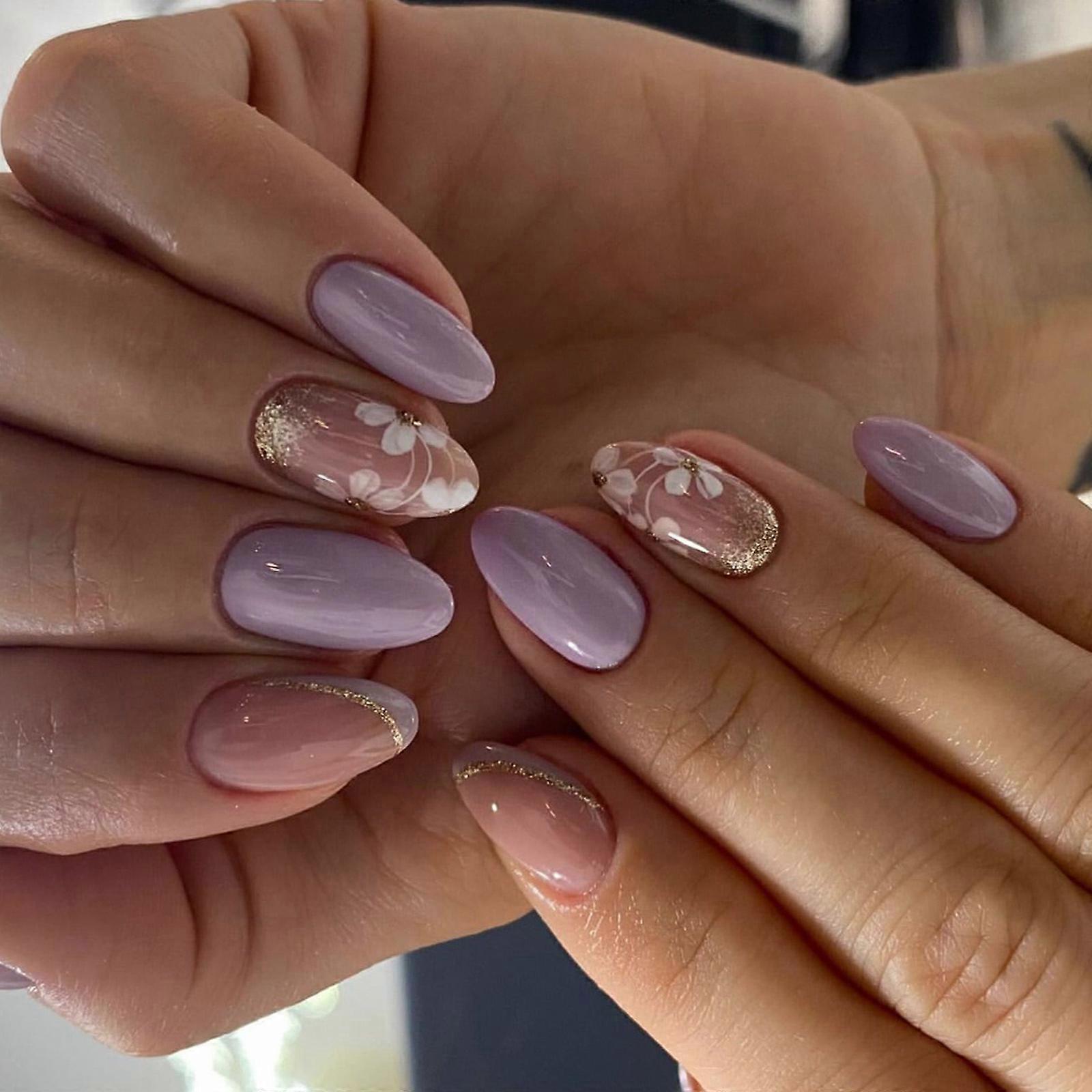 24 Pcs Almond Shape False Nail White Flowers Artificial Nail French Tip Stick On Nail Glossy Press On Nail for Woman Multicolor