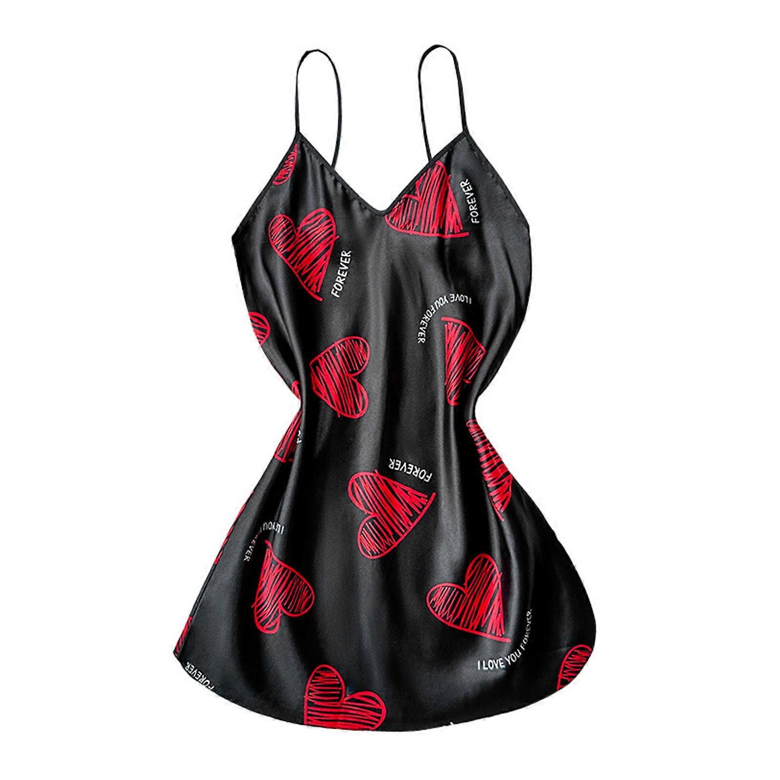Women Spaghetti Straps V Neck Lingerie Dress Heart Print Nightdress Ice Silk Cami Sleepdress Nightgown Pajamas Nighties Black XL