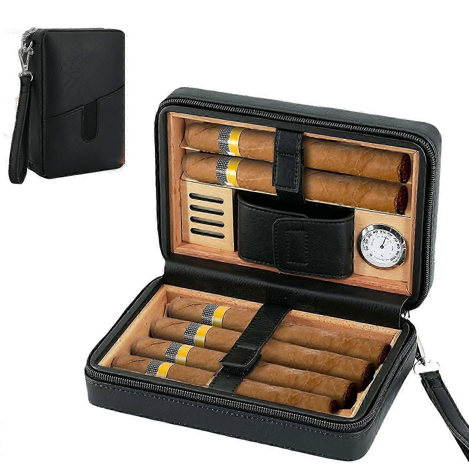 25-26 Portable Cigar Humidor Travel Case Cedar Wood Lined Leather 6-Cigar Capacity Built-In Hygrometer Humidifier Black