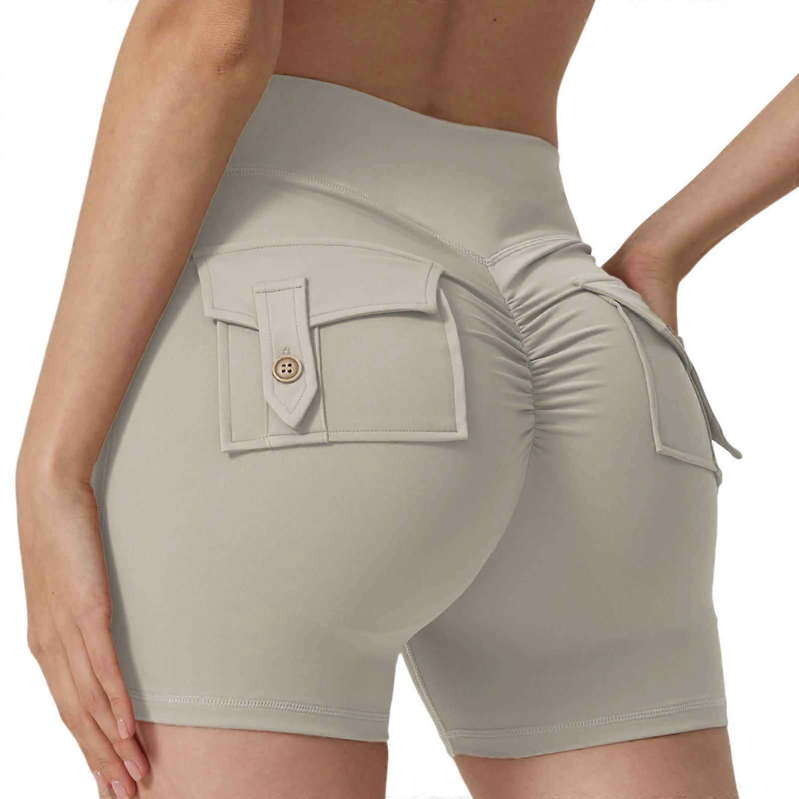 Fitness Shorts with Pockets, Soft Yoga Shorts High Waist Gym Short Pants High Stretch Legging for Relaxation Light flax S