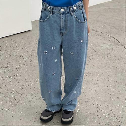 Loose Embroidered Knot Denim Jeans Women's Faion Age-Defng Design Wide Leg Casual Pants Versatile Casual Jeans