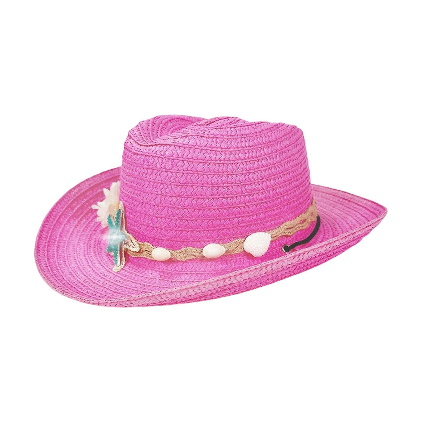 Vacation Children Straw Hat Breathable Straw Cowboy Cap Drawstring Sun Hat For Outdoor Adventures Birthday Celebration Pink