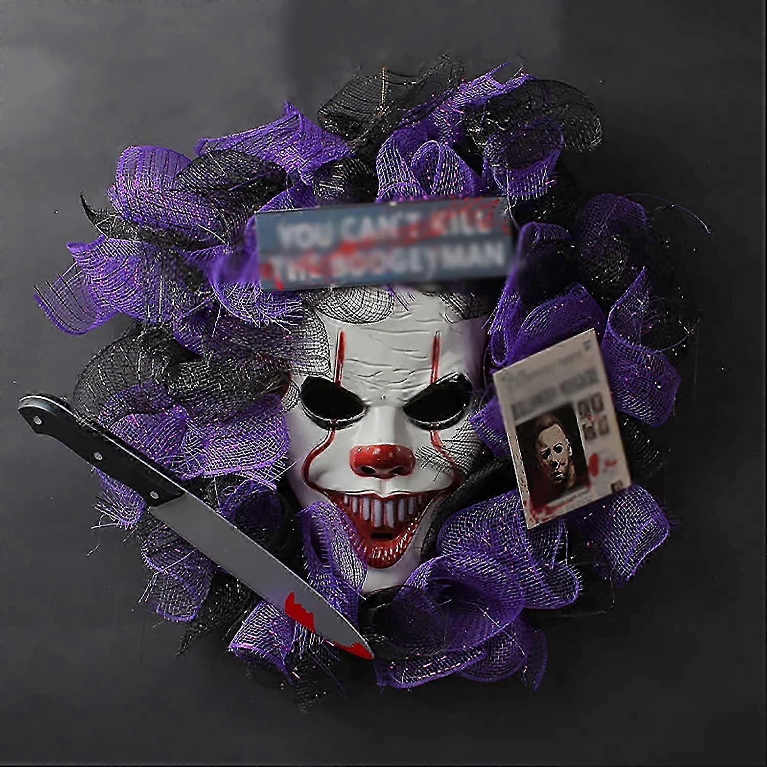 Skull Wall Decor for Halloween with Purple Wreath and Scary Mask