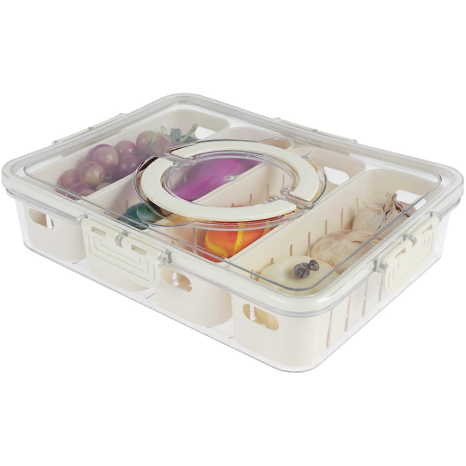 Description: This 4-compartment snack platter organizer is perfect for sorting different food items such as sweets, fruits, cakes, desserts and meats. The lid comes with a hidden handle on the top, perfect for you to carry around and use on the go. It can also make your kitchen and countertop neat and clean to avoid clutter, which is a good choice for your snack storage. Key Feature: 4 Compartments Snack Storage Tray: This snack storage tray comes with 4 compartments, you can store your food separately, such as snacks condiments, dried fruits, cakes and desserts. Snack Divided Platter with Silicone Sealing Ring: The lid of this snack divider tray is equipped with a silicone sealing ring, which is a good sealing to keep the food fresh and prevent dust and insects from entering, making it safer to use. Specification: Product Name: Divided Serving Tray Color: As Shown Material: PET + PP + Silicone Size: Divided Serving Tray: 31 x 24 x 7cm / 12.2 x 9.4 x 2.8 inches Compartment: 20.5 x 6.6 x 5cm / 8 x 2.6 x 1.97 inches Note: 1.There may be slight differences between the picture and the actual color of the commodity. We will try our best to show you the exact color. 2.Please allow slight dimension difference due to manual measurement. 【Parts List】 1 × 4 Compartment Divided Serving Tray [4 Compartments Divided Serving Tray] This divided serving tray measures 31 x 24 x 7cm / 12.2 x 9.4 x 2.8 inches, it comes with 4 draining baskets, each draining basket measures 20.5 x 6.6 x 5cm / 8 x 2.6 x 1.97 inches. You can store your food individually to avoid cascading flavors, and it is also easy to clean your ingredients for daily use. [Lid with Silicone Sealing Ring] The lid has a silicone sealing ring to ensure a good seal, which keeps food fresh and prevents it from coming into contact with air and dust. [Hidden Handle] There is a hidden handle on the lid of the outer transparent container. The handle is designed with a flip-folding design that fits tightly into the lid without taking up much space, making it very convenient to carry or store on the go. [High Quality PET, PP and Silicone Seal] The outer box of this food storage box is made of high quality PET and the lid comes with a silicone seal. The inner box and handle are made of high quality PP, safe and environmental protection, strong and durable. [Multifunctional] This snack divider tray has 4 small compartments inside, you can store your food separately to avoid mixing them together, which helps keep your kitchen or countertop clean and tidy. You can also separate snacks, condiments, dried fruits, appetizers, nuts, toppings and any other supplies that need to be stored separately.