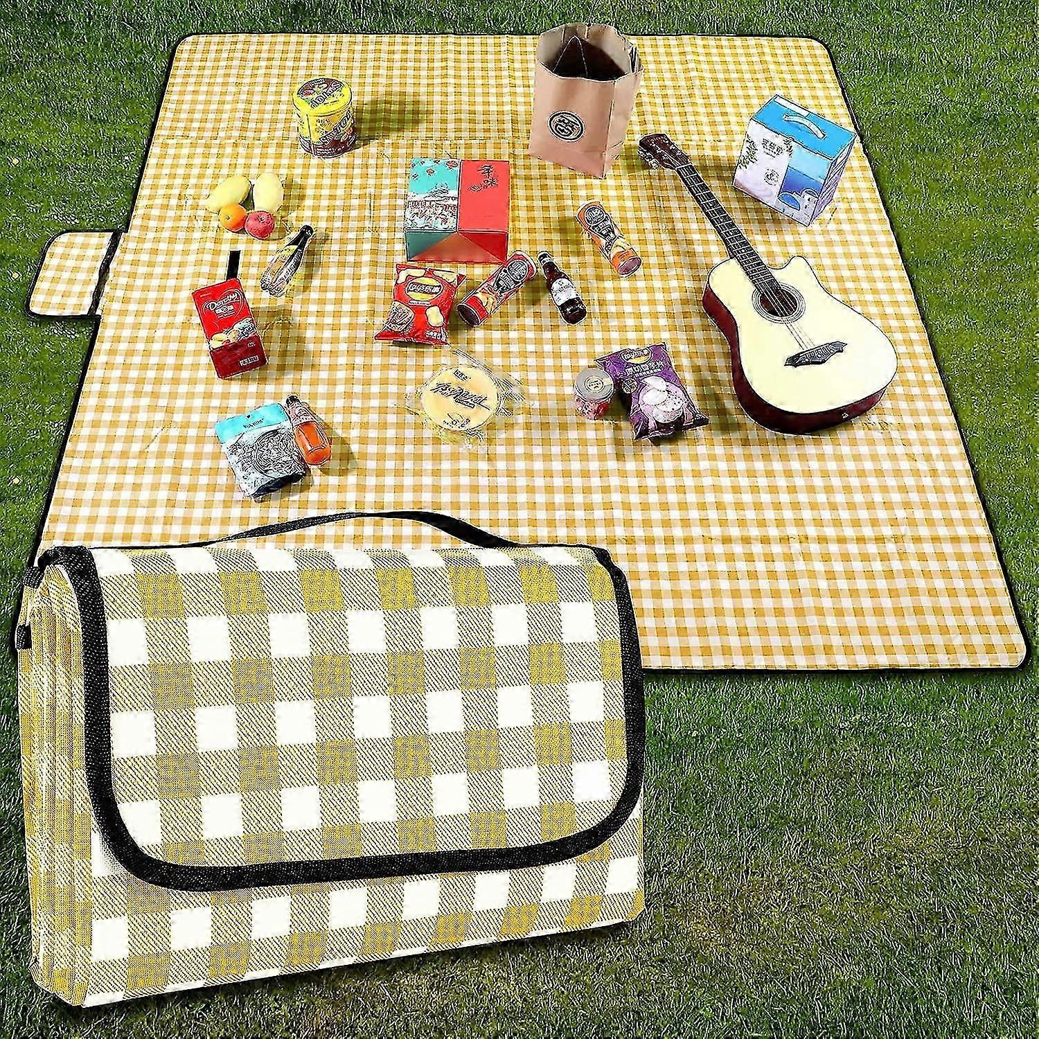 Yellow Checkered Waterproof Picnic Blanket with Handle - Lightweight and Washable for Outdoor Use