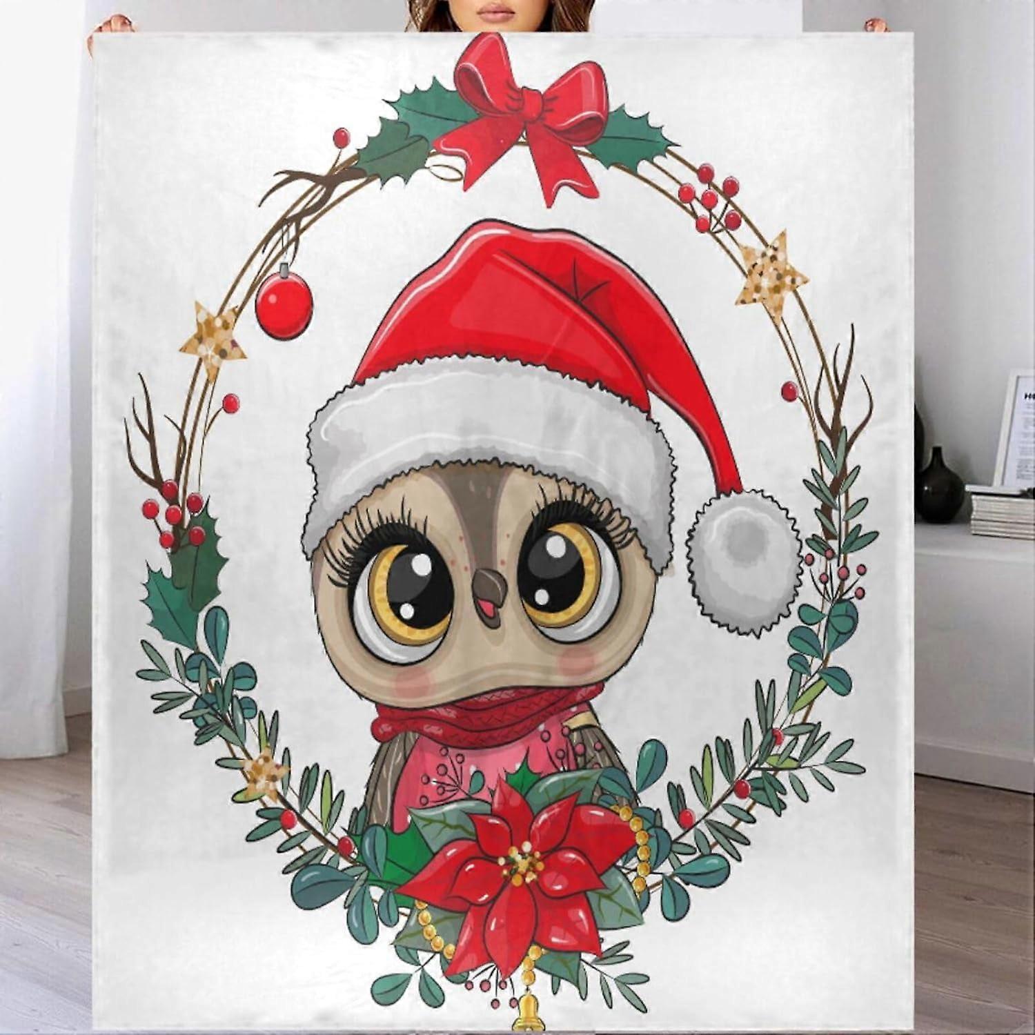 50x60" Cute Owl Santa Hat Throw Blanket - Soft Flannel Fleece, Lightweight & Warm, for Couch, Bed, Chair – Christmas Wreath Cartoon Design