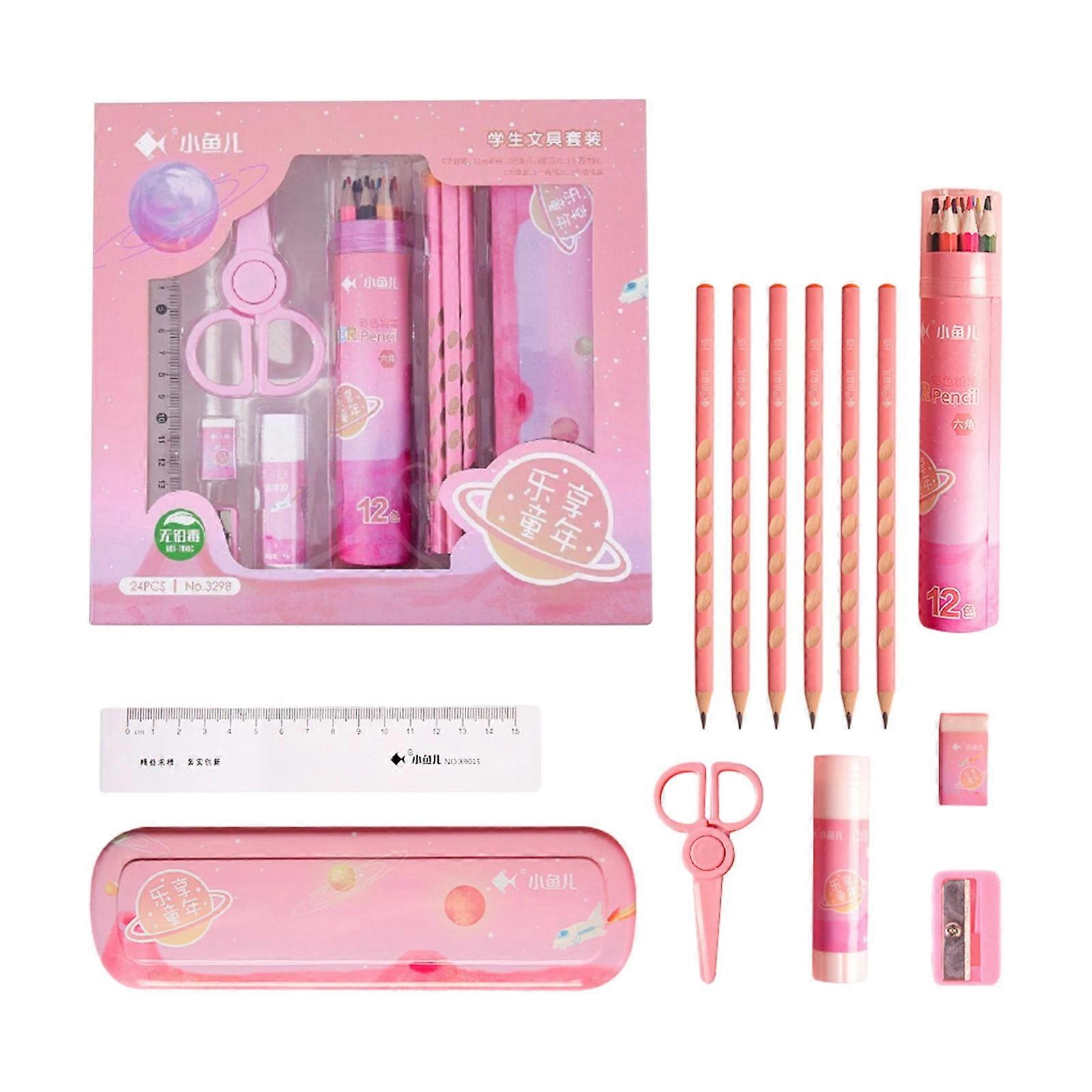 Ruhiku GW Adventure Children Fun: 24-Piece Stationery Set with 4 Pencils, 12 Colored Pens, Glue, Eraser, 15cm Ruler, Scissors, Sharpener