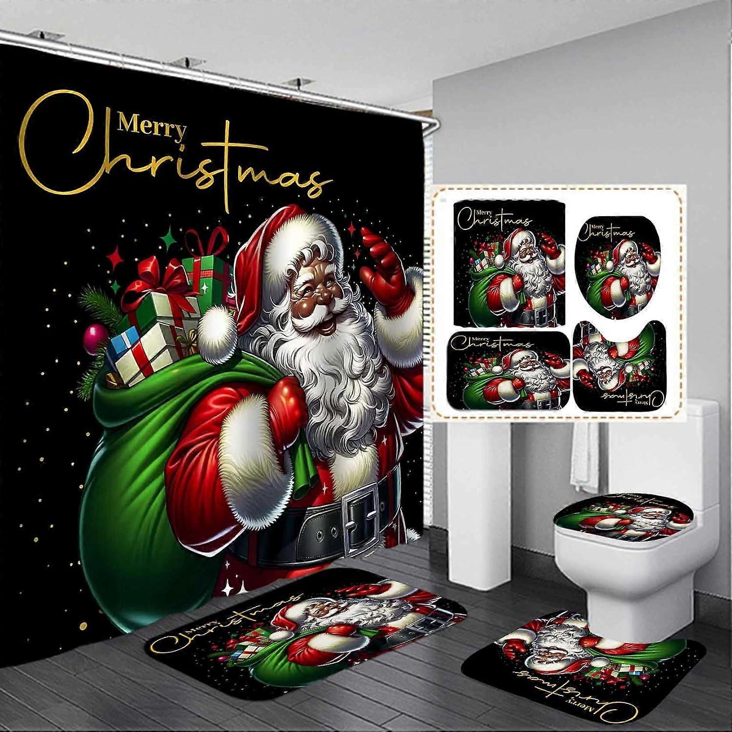 4PCS Merry Christmas Shower Curtain Set, Teal Farm Truck Xmas Balls Winter Rustic Farmhouse Decor with Non-slip Bath Mat, Toilet Rug, compatible with