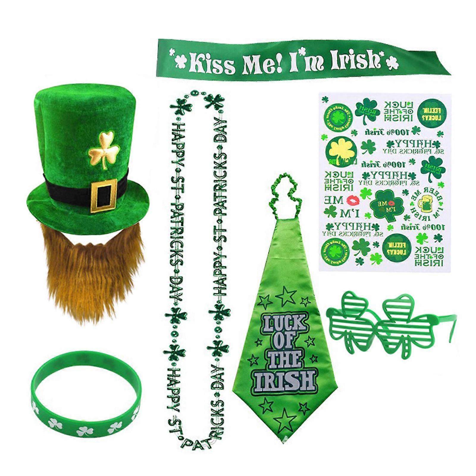 7Pieces Patrick Day Costume Set Leprechaun Hat with Beard, Banner, Braclelet, Glasses, Bead Necklace 7 piece set