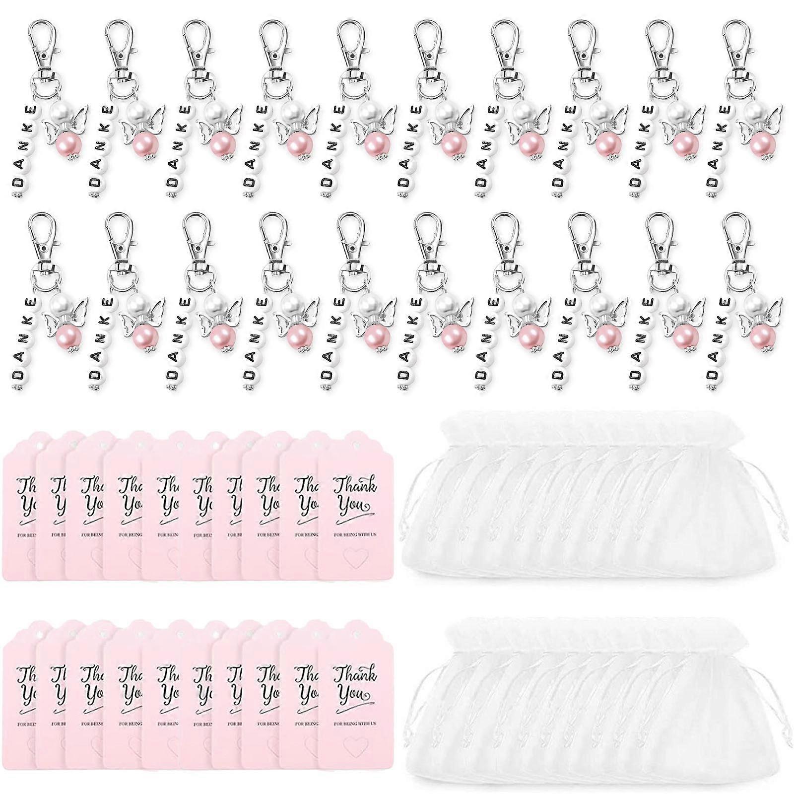 20pcs/set Wing Designs Keychain Favor Organza Gift Bags Thank You Tags for Guests Favor Bridal Baby Shower Wedding Party Pink