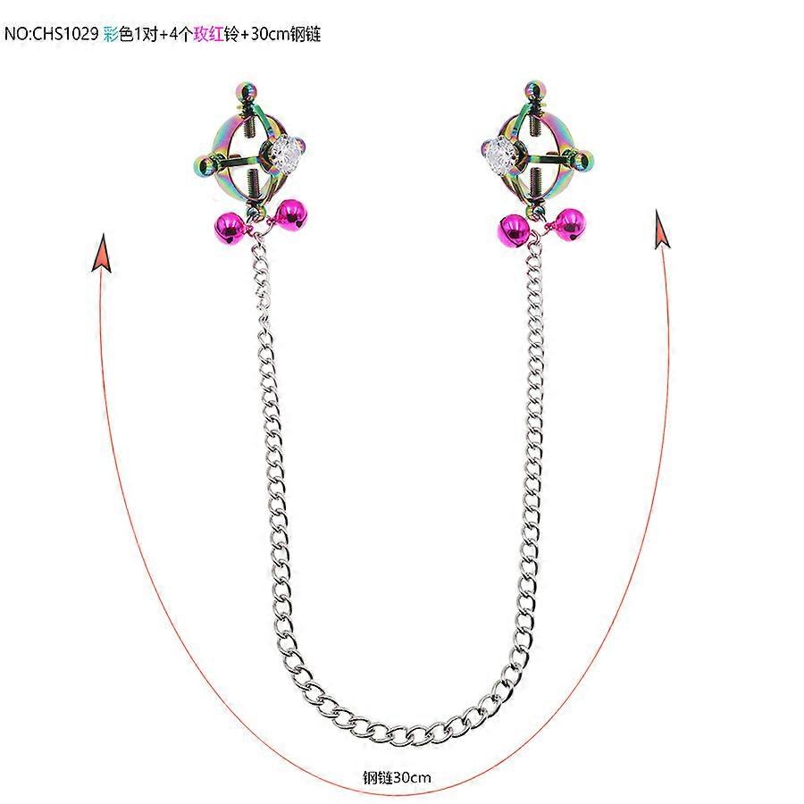 A pair of rhinestone-embellished colored nipple clamps + a pair of rose-red double bells + a 30cm steel chain. These are adult toys, sex