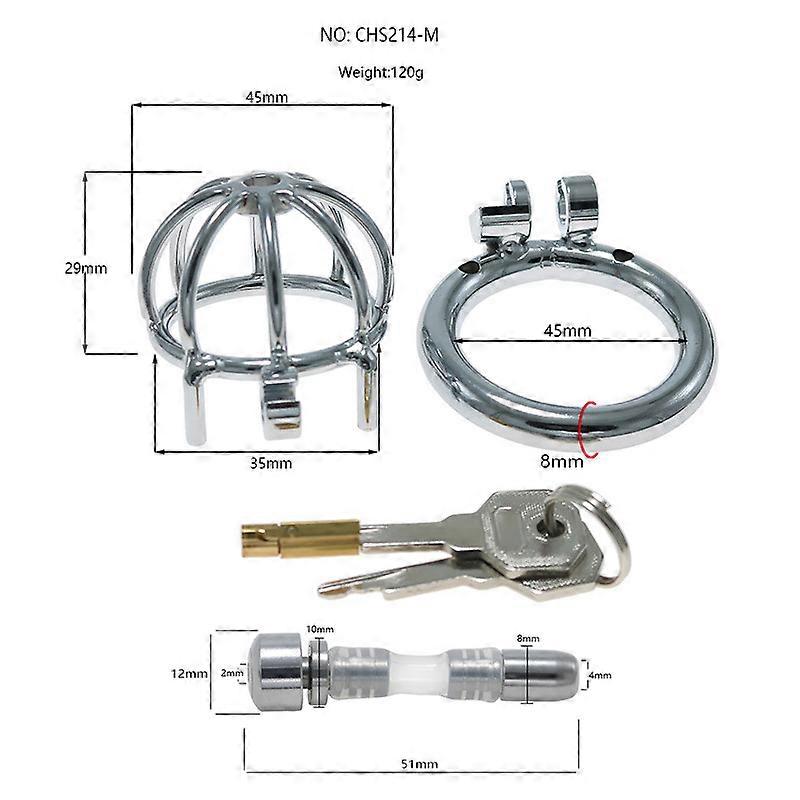 The set includes a 45mm retaining ring, a short and thick tube, and a metal hemispherical chastity device/lock. It's a male-wearable adult