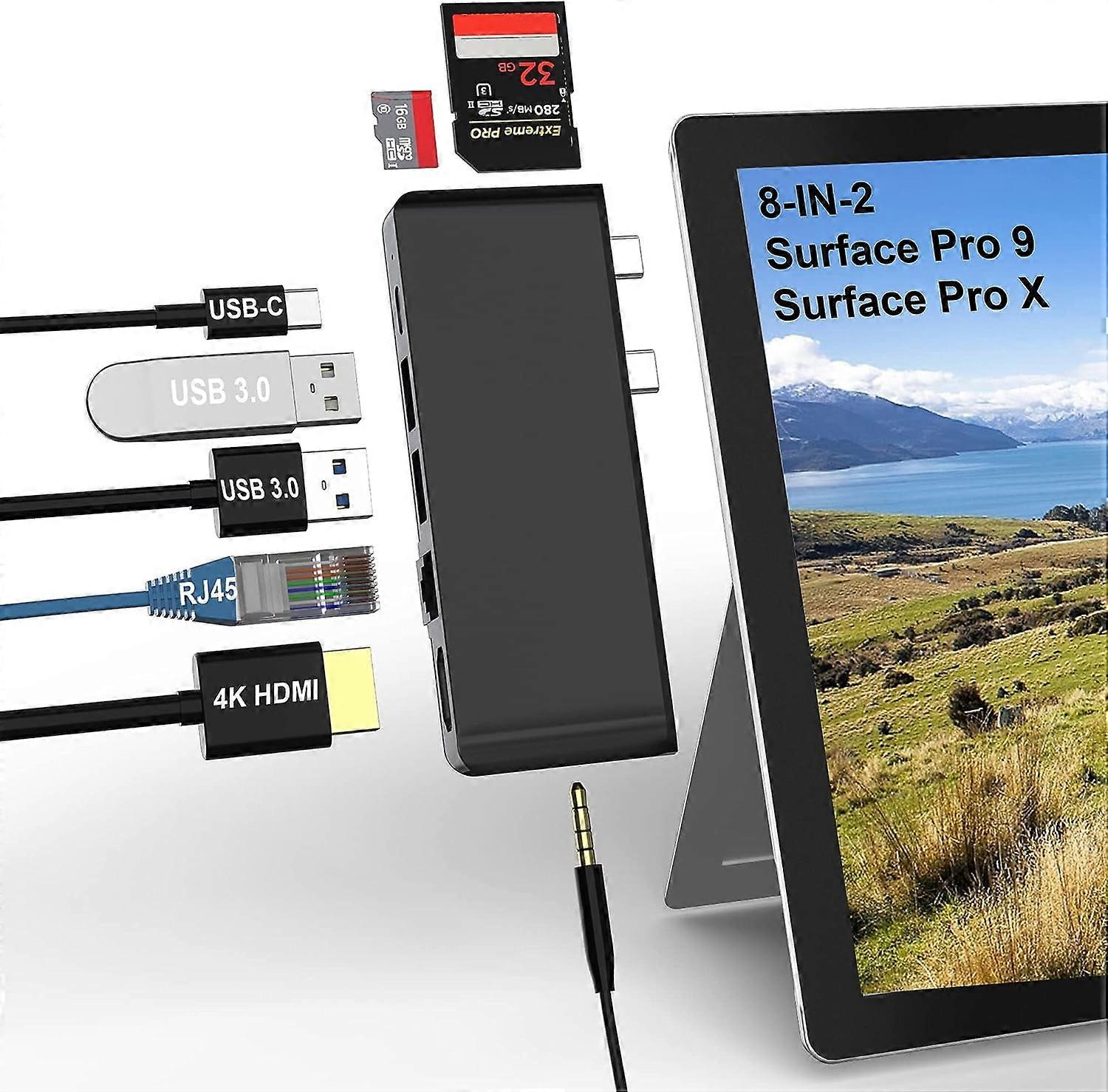 About this item 😃 8-in-2 Surface Pro 9 Hub Docking Station Specially developed for rosoft Surface Pro 9, it expands 2 USB-C connections into 8 ports (2X USB 3.0 ports, 1X 4K HDMI port, 1X Type c 3.1 Thunderbolt 4 port (video + data transfer + PD charging), 1 X 100M Ethernet port, 1 X 3.5mm audio port, 1X TF (ro SD) slot, 1X SD slot. Made from a collection of high-quality materials, Surface Pro 9 accessories are compact and portable, all-in-one for on-the-go travel and office use. 😃 4K HDMI Adapter This HDMI port supports up to 4K@30Hz video resolution, while backwards supporting 2K/1080p/720p/480p/360p resolution.Support extended and mirroring modes to freely display high resolution 4K@30Hz or Full HD 1080p video from your laptop to HDTV, monitor or projector through the HDMI port, providing you with ultra high definition visual enjoyment. This Surface Pro 9 hub adapter expands 2 displays to provide more space for your work and life. 😃 High-speed Data Transfer The USB c 3.1 Thunderbolt 4 port speed transfer up to 40Gbps, support PD charging, support transfer video 4K@60H; two standard USB 3.0 ports support up to 5Gbps transfer rate, maximum read speed of 640MB/s, backward compatible with USB 2.0.Built-in SD slot and TF (ro SD) slot Allows easy access to files from memory s at ultra-high speeds of up to 480Mbps, compatible with SD, SDXC, SDHC, ro SD, ro SDXC, ro SDHC s, etc. 😃 100M Ethernet Port & 3.5mm Audio Port 100M adaptive RJ45 Ethernet interface, wired network to ensure a more stable network connection, and wired network switch freely. 3.5mm audio port, with function can receive headphones, connect external 3.5mm interface audio, listen to music, watch video and answer the phone more convenient, to avoid noise and embarrment. 😃 Easy to Use Plug and play, no driver required, light can directly see if the surface pro 9 dock Station is working. Simple and atmospheric aluminum shell is easy to dissipate heat and not easily deformed. Small design, can easily fit into computer bags and pockets, all-in-one function suitable for travel and office use. Warm tips: When the computer case is too thick resulting in unstable contact, it is recommended to take off the case to use.