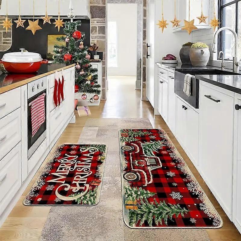 2-Piece Christmas Kitchen Mat Set with Non-Slip Washable Polyester, Truck and Buffalo Check Design for Home and Bathroom Decor