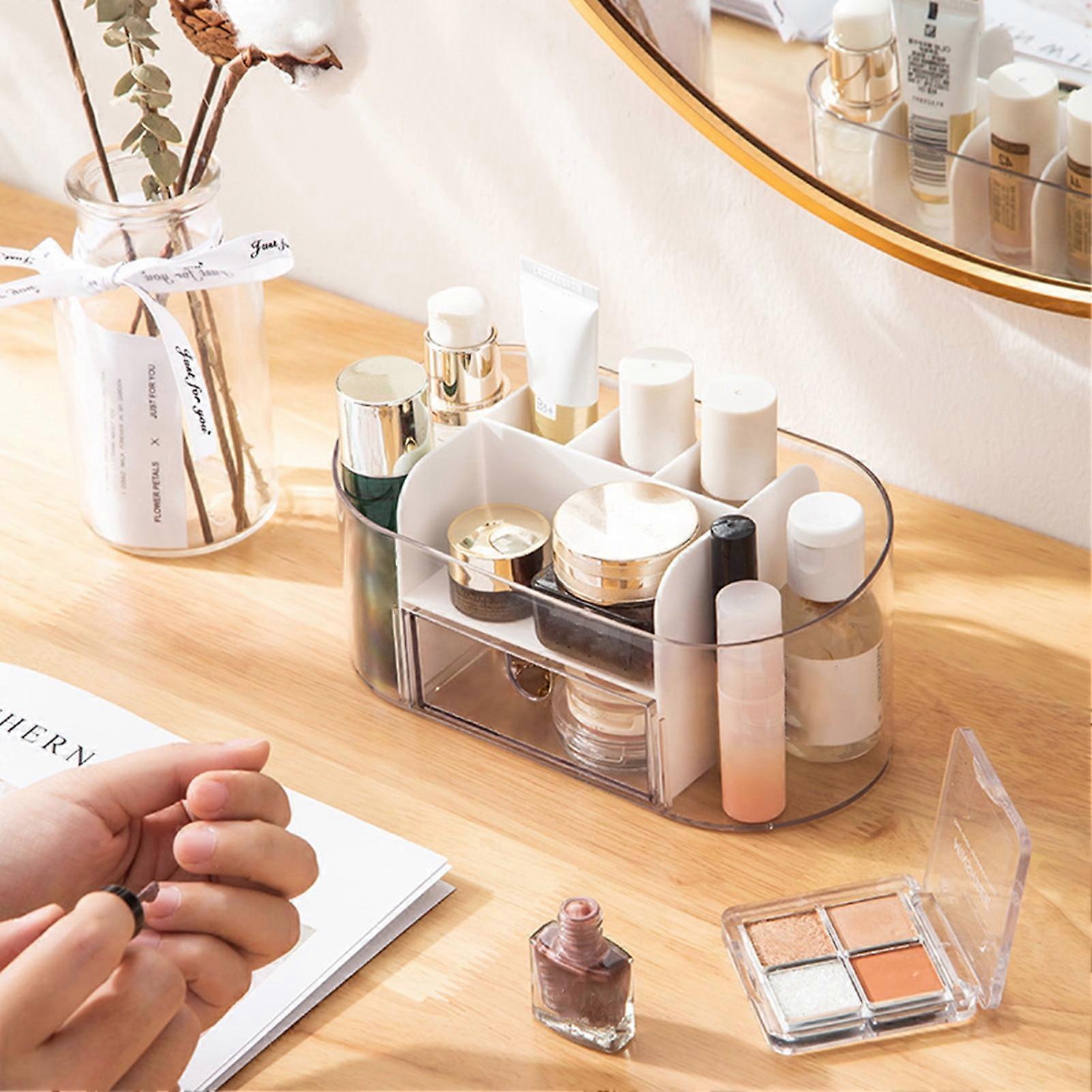 Description: Introducing our desktop storage box, the perfect solution for keeping your cosmetics well-organized and easily accessible. This makeup organizer storage tray comes with detachable compartments and a drawer, allowing you to customize the layout according to your needs. Made of sturdy crystal clear acrylic, this storage tray is built to last. It features a smooth body with scratch-free rounded corners and a non-slip bottom, ensuring that your cosmetics stay in place. The sleek and elegant design of this vanity makeup holder complements any room decor, making it a great addition to your bedroom, bathroom, or office. With its versatile design, this makeup tray organizer can be used on desktops, countertops, cabinets, cupboards, and drawers. It is perfect for storing lipsticks, lip glosses, eyeliners, mascaras, foundations, face creams, and more. Say goodbye to the hassle of searching for your favourite products - our countertop display case keeps everything within easy access. Not only is this makeup storage tray practical and functional, but it also makes a thoughtful gift. Surprise your friends, girlfriend, wife, daughters, or mother with this stylish and useful organizer on special occasions like Valentine's Day, Mother's Day, birthdays, Christmas, New Year, and more. Item Name: Desktop Storage Box Material: PET, HIPS Style: Modern And Simple Features: with Drawer, Compartment, Transparent Size Details: L: 19cm/7.48", W: 9cm/3.54", H: 8.5cm/3.35" (Approx.) Notes: Due to the light and screen setting difference, the item's color may be slightly different from the pictures. Please allow slight dimension difference due to different manual measurement. Package Includes: 1 x Desktop Storage Box Say goodbye to the hassle of searching for your favourite products - our countertop display case keeps everything within easy access. The sleek and elegant design of this vanity makeup holder complements any room decor, making it a great addition to your bedroom, bathroom, or office. This makeup organizer storage tray comes with detachable compartments and a drawer, allowing you to customize the layout according to your needs. Made of sturdy crystal clear acrylic, this storage tray is built to last. It features a smooth body with scratch-free rounded corners and a non-slip bottom, ensuring that your cosmetics stay in place. With its versatile design, this makeup tray organizer can be used on desktops, countertops, cabinets, cupboards, and drawers.