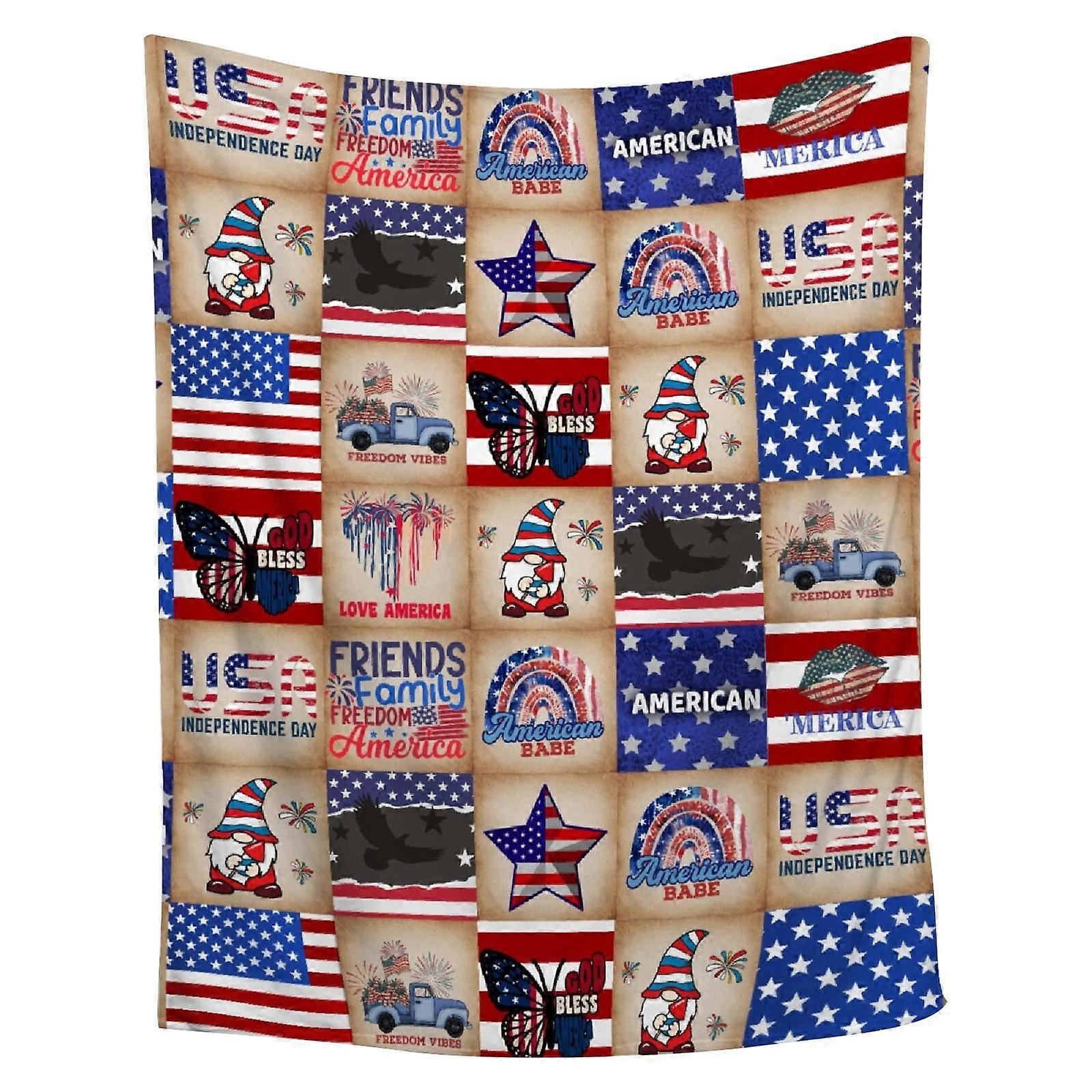 Patriotic 4th of July Blanket and Throws, American National Flag Flannel Fleece Blanket for Couch Bed Decor, Red White Blue Star Gnome Print,