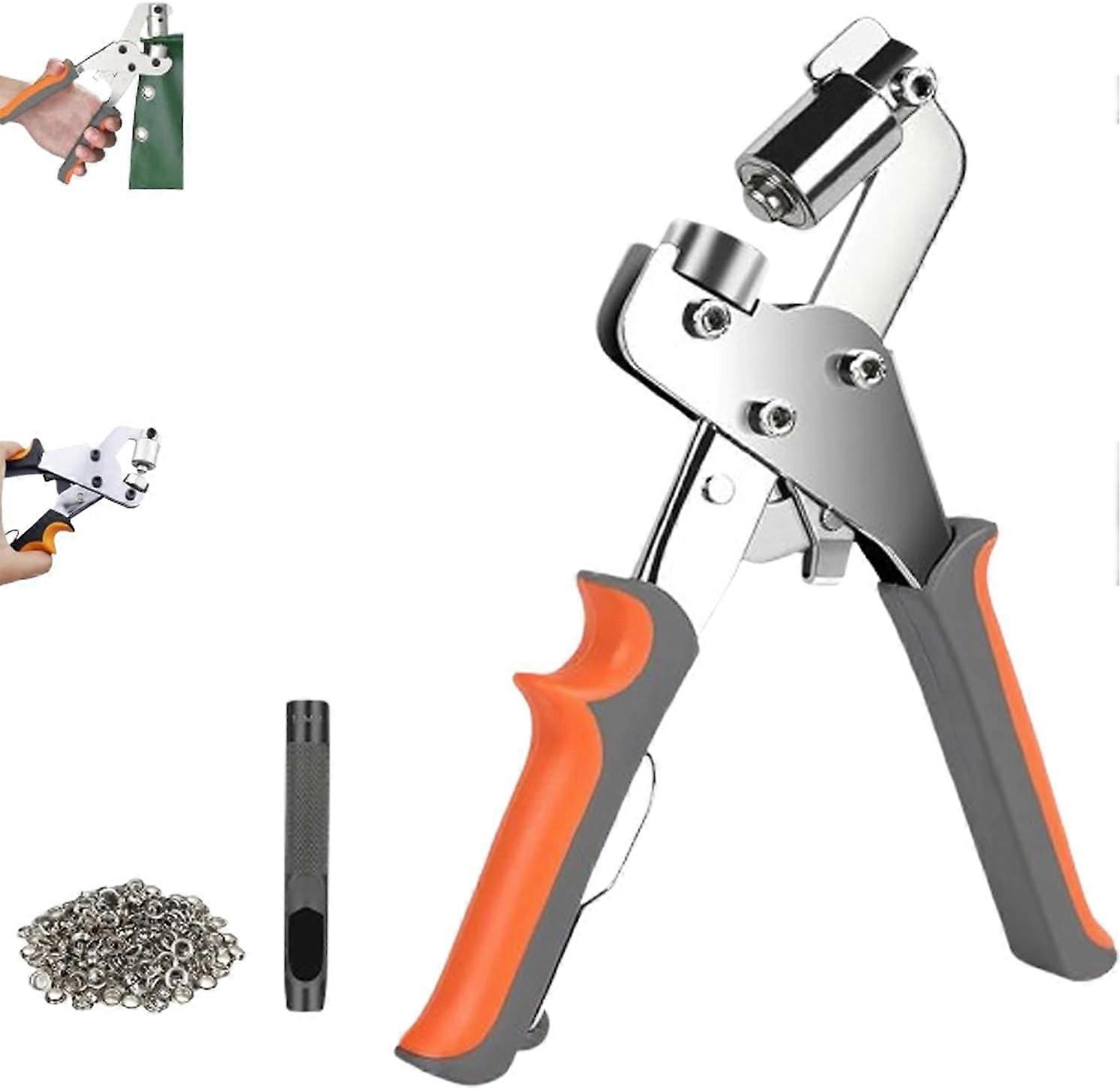 Product DescriptionProduct Description Features: 1.Can be used for many DIY projects and repairs 2.Strong metal frame for piercing dense fabrics 3.Rapid and reliable eyelet placement 4.Ergonomic handle for easy gripping 5.Lightweight and compact, easy to carry and store Specifications: Name: Eyelet Pliers For Tarpaulins Material: Iron Alloy Electroplating Color: Orange Gray Perforation Diameter: 10 mm Function: Manual Buckle Pliers Product Includes: 1PCS * eyelet pliers for tarpaulins 1PCS * Black Punch Stick 100PCS * Silver buckles/Gold buckles/Black buckles Note: 1.Due to different monitors and lighting effects, the actual color may be slightly different from the picture 2.Due to manual measurement and different measurement methods, please allow a deviation of 1-3 mm, Thanks for your understanding Durable and Robust Construction:The Eyelet Pliers for Tarpaulins are crafted from premium materials, ensuring long-lasting durability and strength to handle tough fabrics like tarps, awnings, and tents with ease Effortless Hole Punching:These Eyelet Pliers for Tarpaulins simplify hole punching, eliminating the need for pre-sewing or cutting, making DIY projects quicker and easier Easy and Efficient Eyelet Installation:Experience fast and reliable eyelet installation with the Eyelet Pliers for Tarpaulins, designed for smooth operation and reduced workload Comfortable, Ergonomic Handle:The Eyelet Pliers for Tarpaulins feature an ergonomic handle, offering a comfortable grip that reduces hand strain during extended use Versatile and Portable for Various Applications:Ideal for DIY projects, the Eyelet Pliers for Tarpaulins are perfect for adding eyelets to tarps, tents, bags, and more, while the lightweight design makes them easy to carry and store