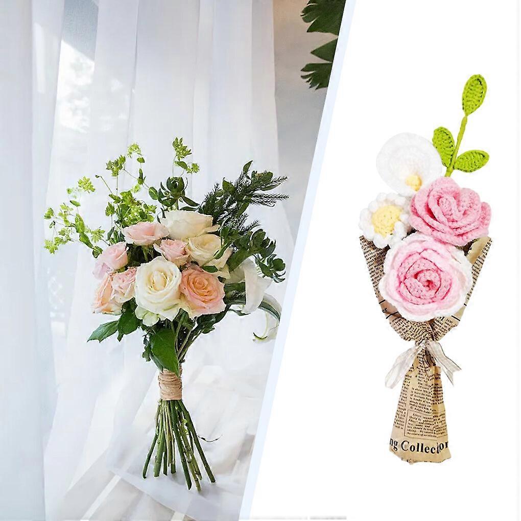 Hand Finished Crochet Flower Bouquet, Compatible with Home Decor, 15Inch Artificial Roses, Sunflowers, Daisies, Pink Knitted Flowers for Vase,