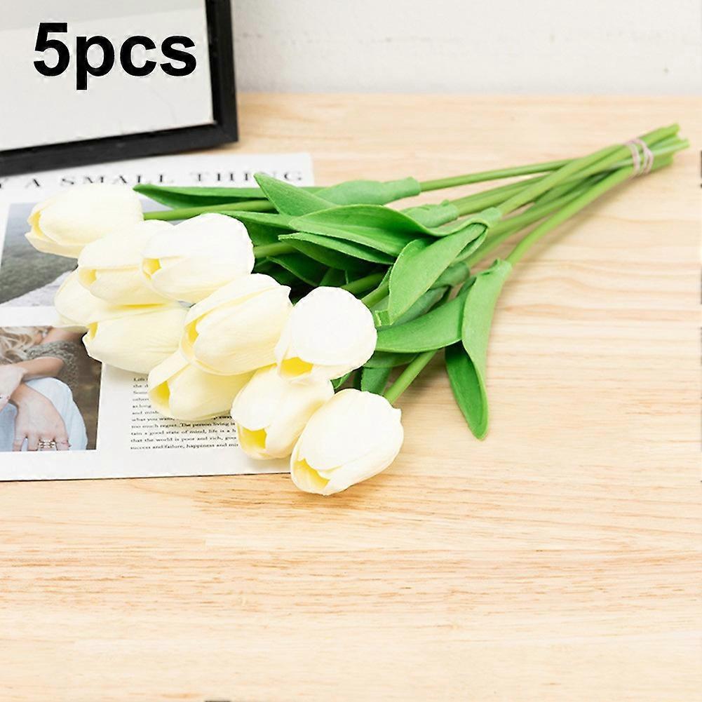 Milky White Tulips Artificial Flowers 5pcs/Bunch, Real Touch PU Faux Tulips for Home, Office, Wedding Decor, Bouquet Arrangement