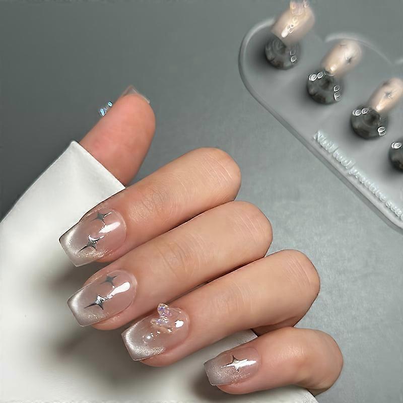 Handmade 10Pcs French Press-on Nails with 3D Stars & Butterflies, Crystal Tips, Reusable Stick on Nails with Glue