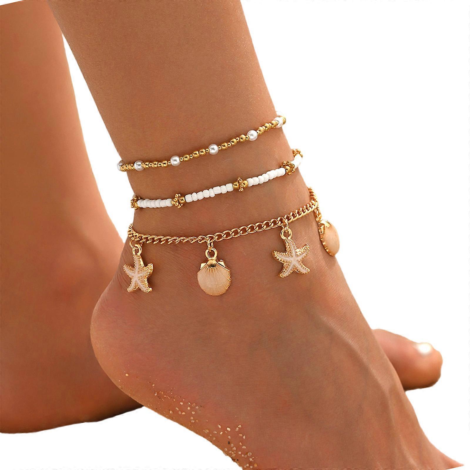 Multilayer Glass Bead Ankle Bracelet Tropical Seashells Starfish Designs Bohemian Foot Jewelry Pieces Multicolor