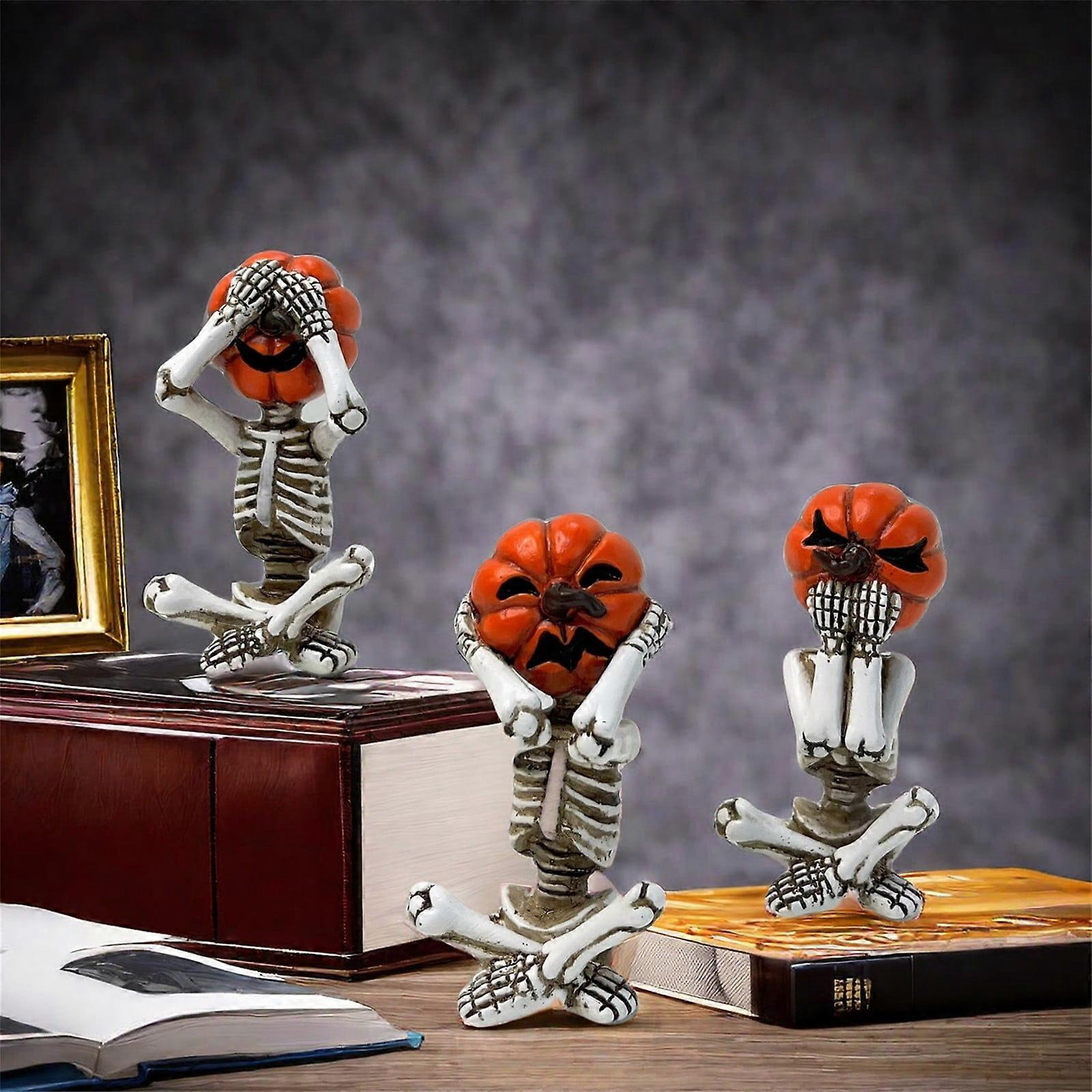 Yakbaofuo Skeleton Statues with Pumpkin Heads, Compatible with Halloween & Christmas Desktop Decor, Don't Listen Don't Talk Don't Look