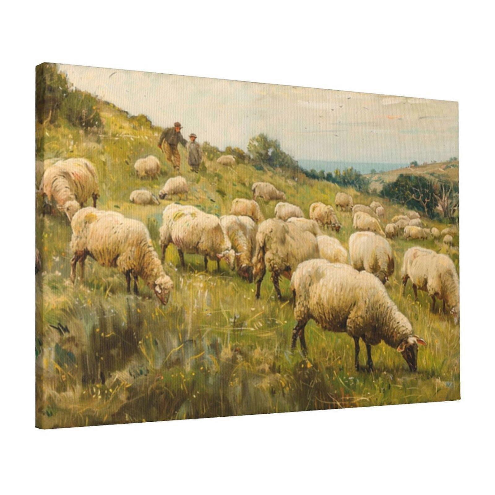 Sheep Grazing in Pasture - 16x24 Inch Framed Canvas Wall Art