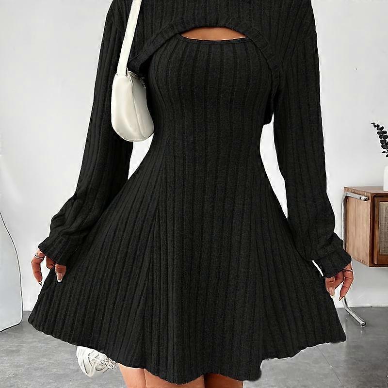Solid Color Ribbed Dress Set for Women - Long Sleeve Hoodie, Shrug Top & Sleeveless A-line Tank Dress, Casual Elegant Black Chic Outfits - C