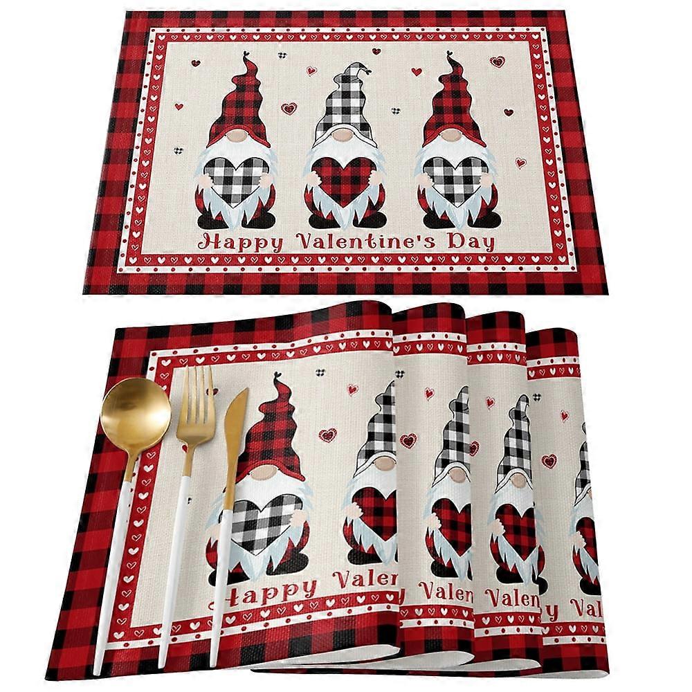Valentine's Day Placemats Set of 4, Vintage Heart-Shaped Cute Gnomes I Love U, Heat-Resistant & Non-Slip, Cotton Linen for Dining Table