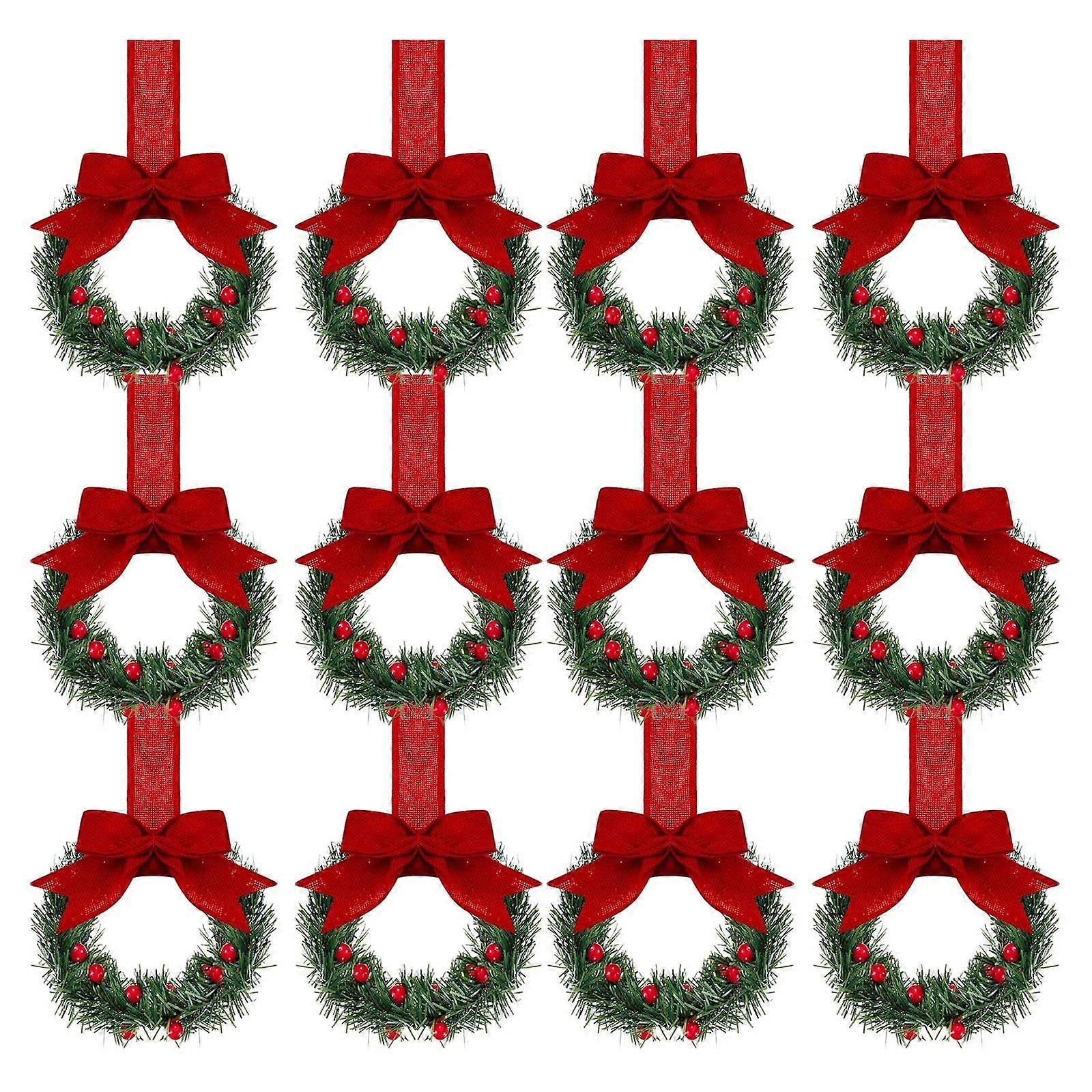 12 Pcs Christmas Wreath Decorations with Velvet Bow, Mini Artificial Hanging Garlands for Kitchen Cabinet, Door, Window, Wall