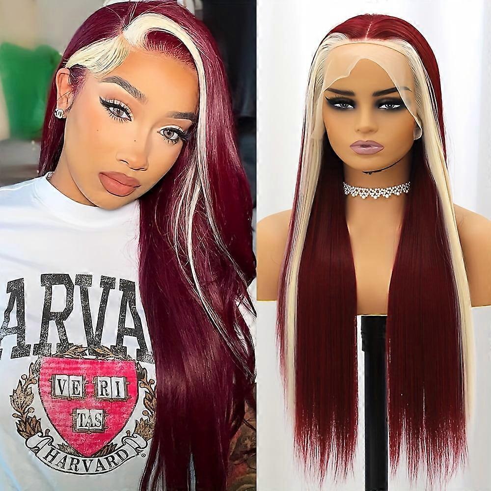 Burgundy Highlight Blonde Lace Front Wig 13x4 26" Heat Resistant Silky Straight Synthetic, compatible with daily & party use