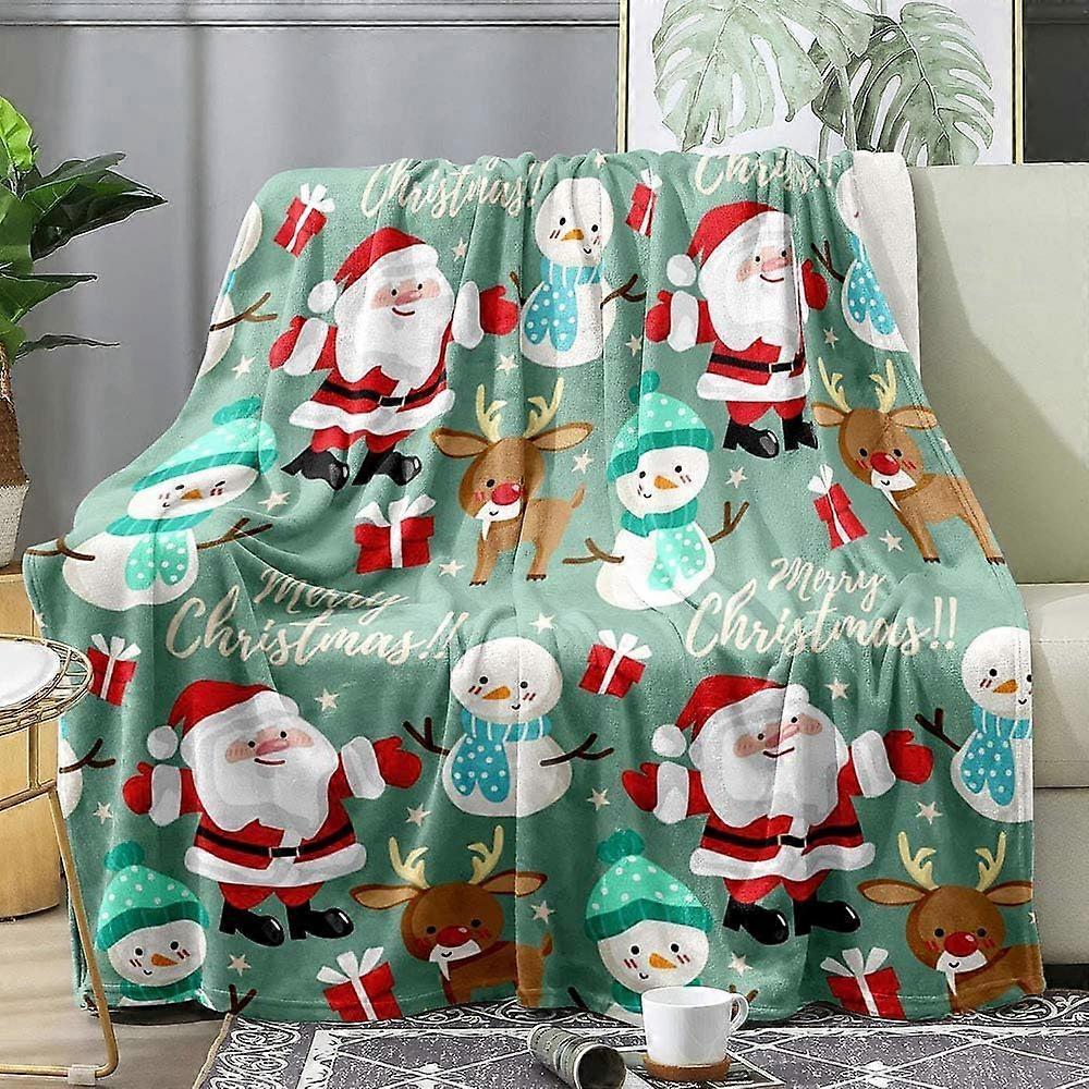 Christmas Throw Blanket, Santa Claus Snowman Reindeer Cartoon Animal Holiday Blanket, Sage Green, Cozy Warm Soft Fuzzy Flannel for Couch, 50"x60"