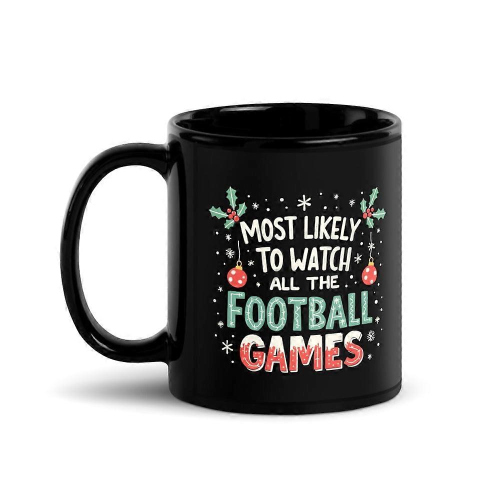 Family Matching Christmas Black Glossy Mug, Most Likely To Watch All The Football Games - Xmas Present (11 oz)