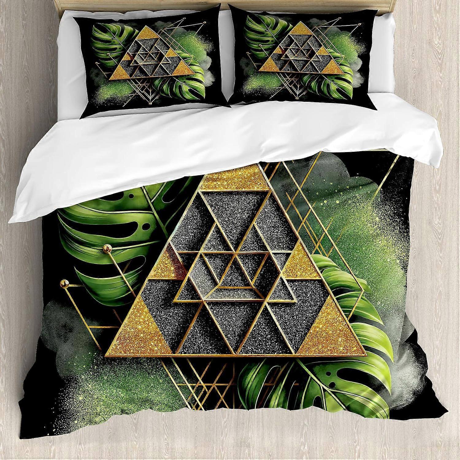 Monstera Duvet Cover Set, Abstract Boho Print Triangular Geometric Pattern with Lines and Leaves, 3-Piece Bedding Set Compatible with Fern Green Pale