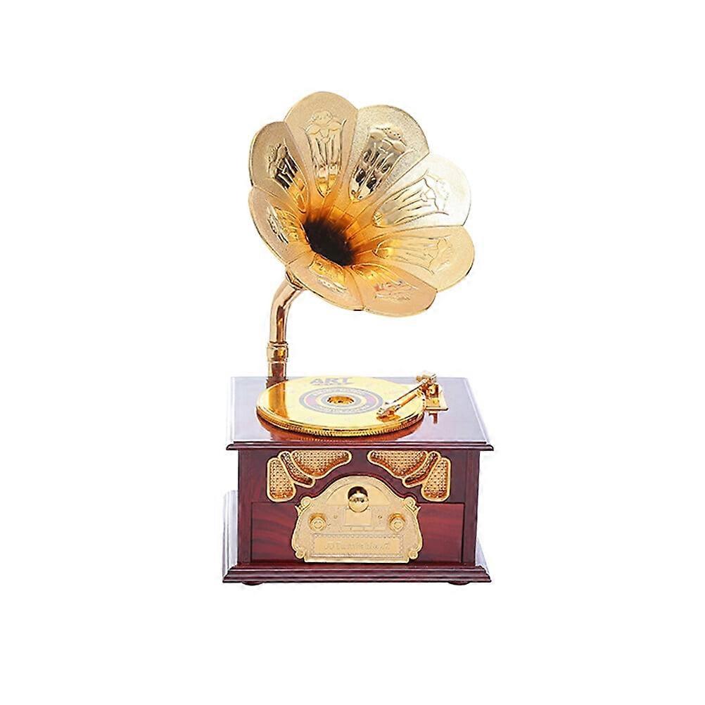 Retro Phonograph Shape Music Box Rotational Music Artware Decorative Desktop Ornament for Home Office Gift (Wood Color)