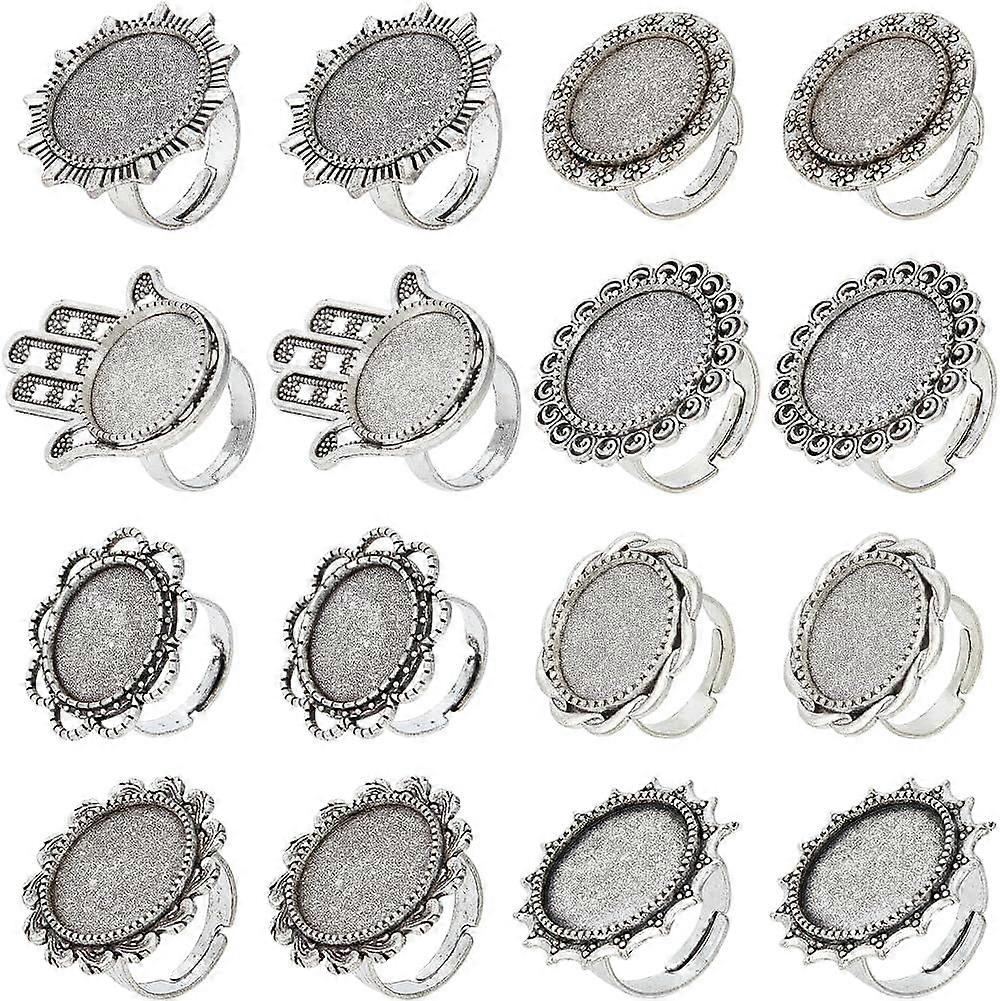 16PCS 8 Styles Silver Adjustable Bezel Ring Blanks, Compatible with Cabochon Settings, Alloy Antique Oval Blank Rings for Jewelry Making Kits, DIY