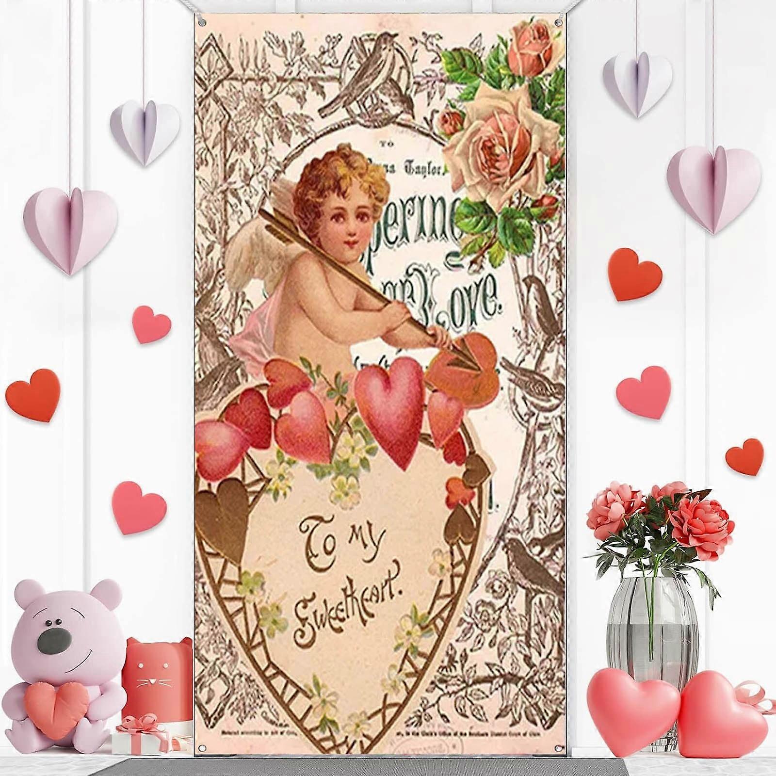 6x3 Ft Vintage Happy Valentine's Day Door Cover, Red Heart Hanging Banner for Indoor Outdoor Party Decor, Valentine's Themed Supplies