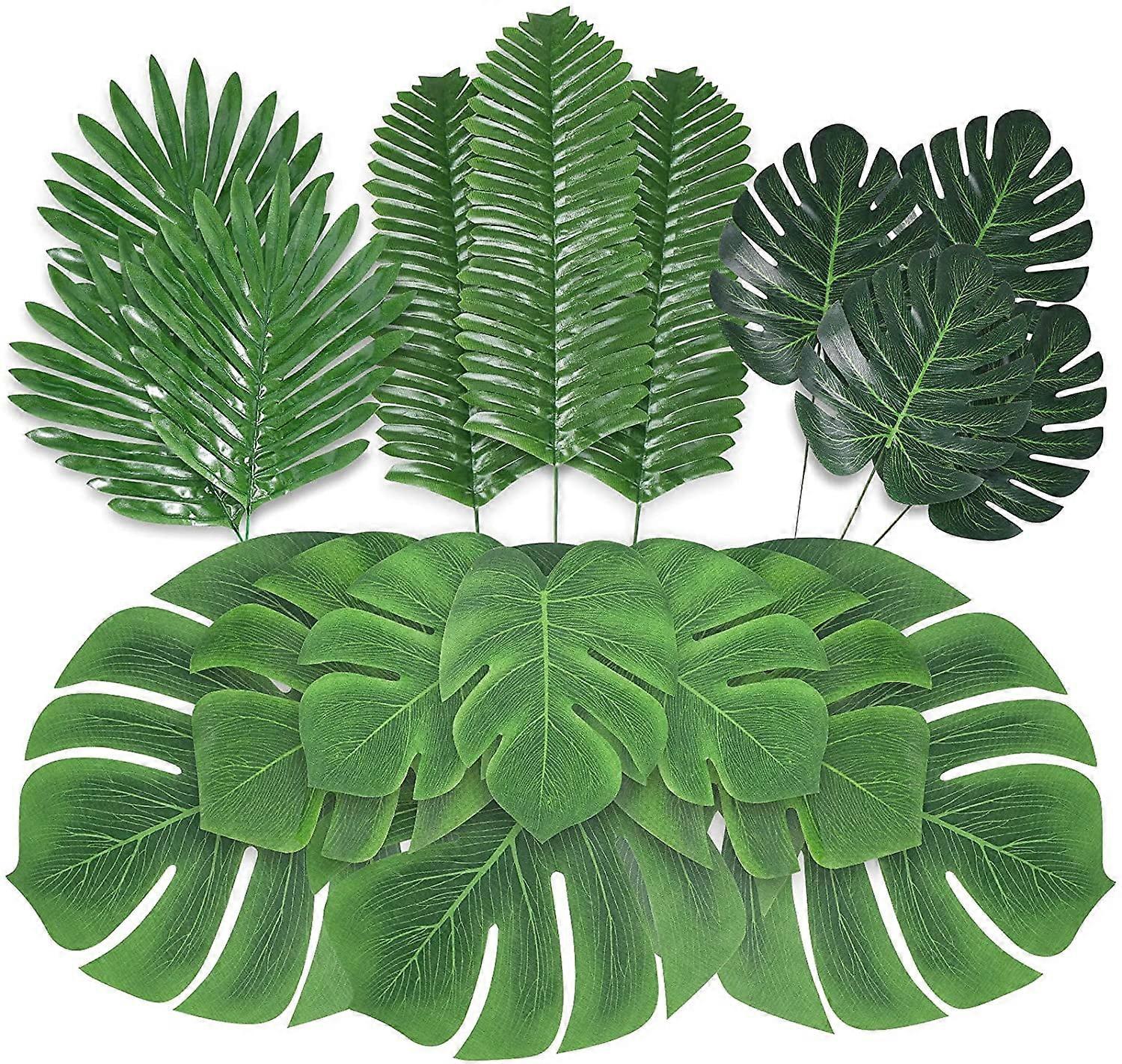 60PCS Artificial Palm Leaves, 6 Kinds Faux Tropical Monstera with Stems for Hawaiian Luau, Jungle Beach Party, Table Decorations