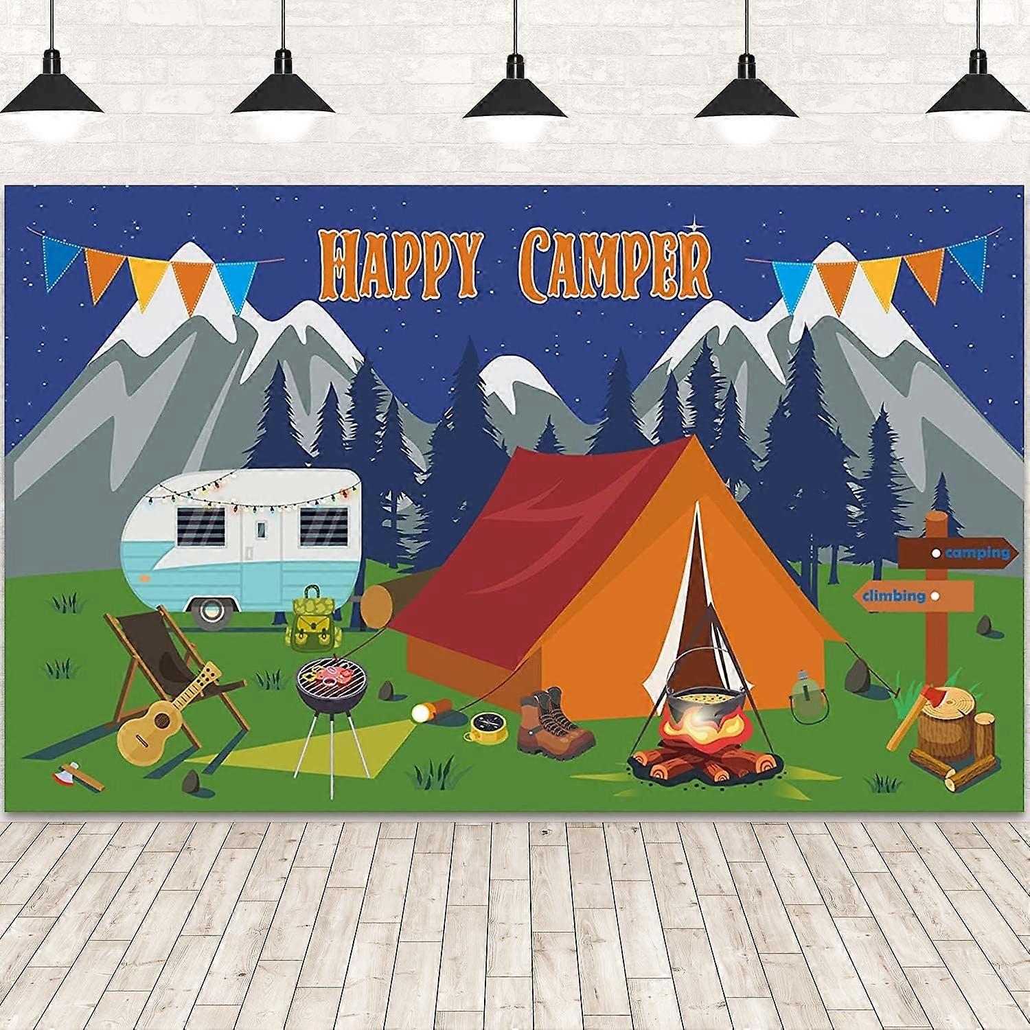 Camping Themed Party Banner - Happy Camper Backdrop, Campfire Forest Adventure Wall Hanging Decor for Kids, Teens Outdoor Party