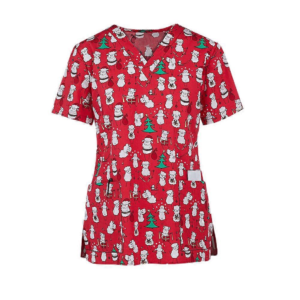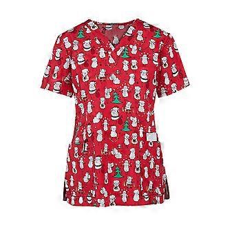 Women Christmas Flowers Short Sleeve V-neck Scrub Tops Working Uniform Blouse UK