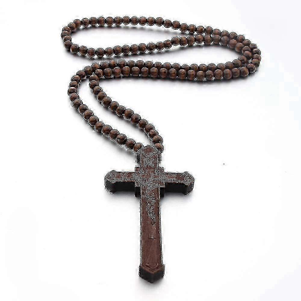 Wooden Large Big Wood Bead Religious Catholic Crucifix Rosary Cross Pendant Necklace for Men, Coffee, Easter Gift w