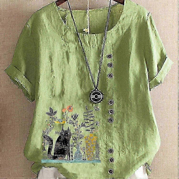 w Women's Fashion Summer Round Neck Short Sleeve T-shirt Casual Cotton Linen Graphic Shirt Leisure Loose Flower Cat Prined Blouse Tops P