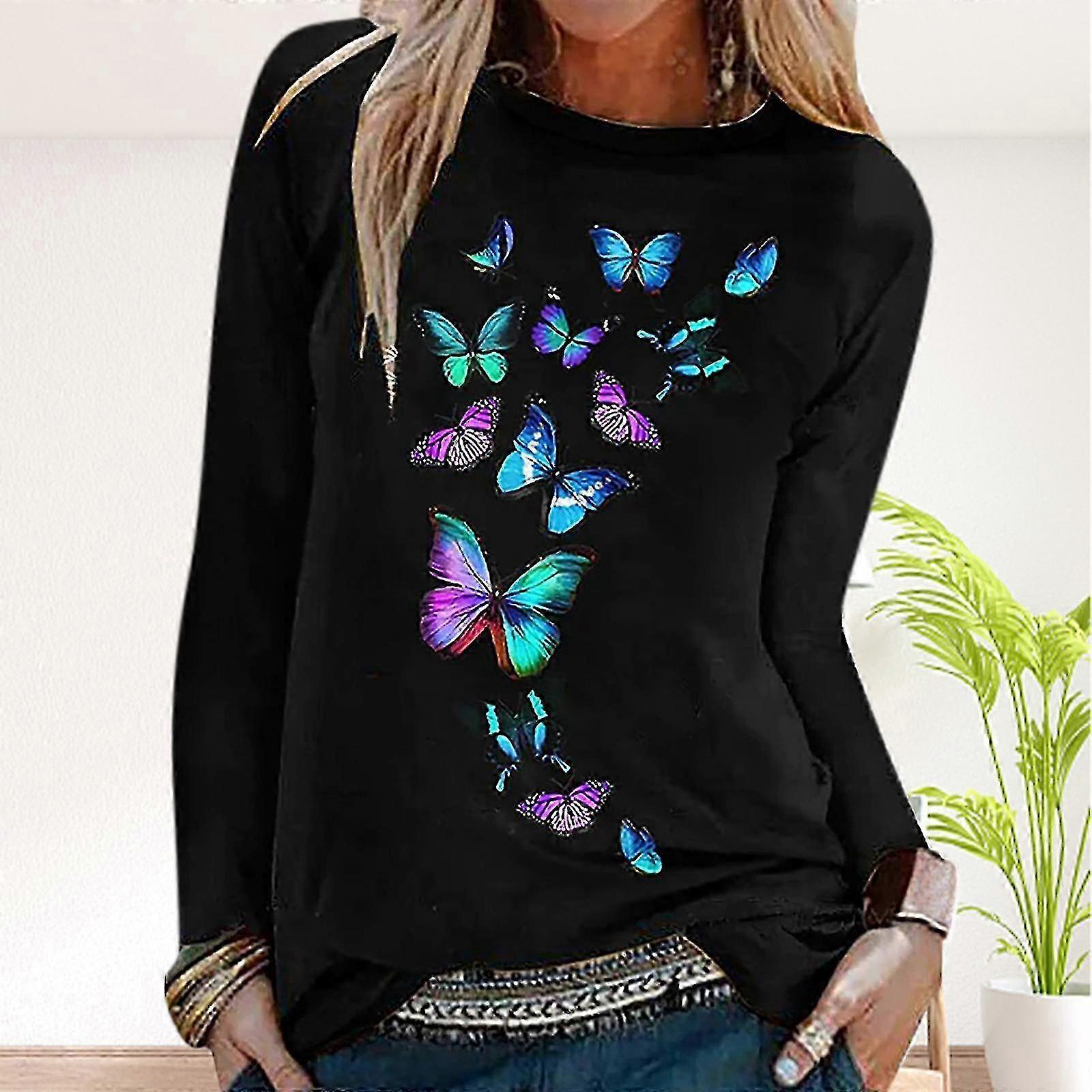 w Women Autumn Tops Loose Cat Beautiful Butterfly Print Causal Long Sleeve T-shirt Top Blouse