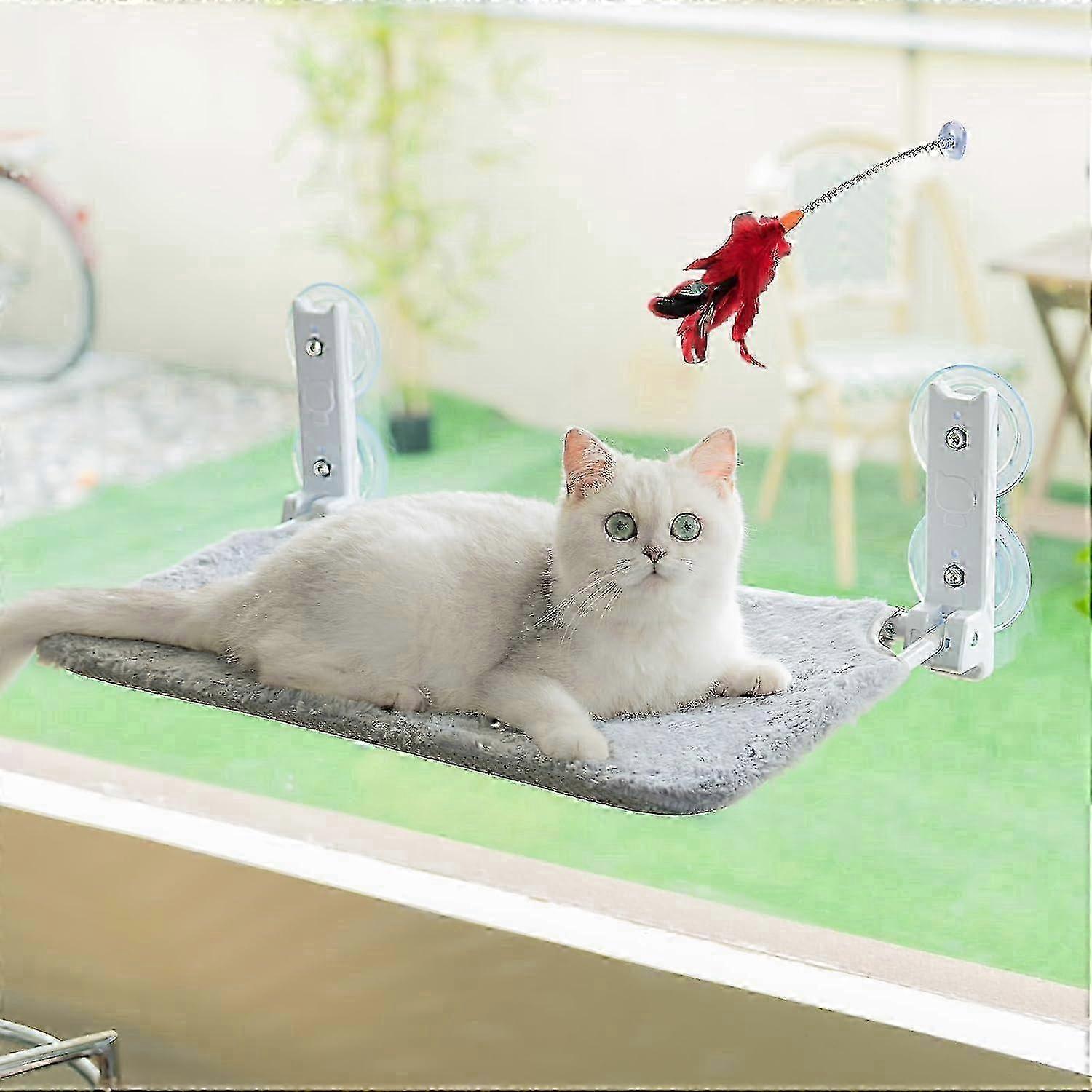 Cordless Cat Hammock: A cat window hammock for all seasons. Includes: 1 set of suction cup cat hammock; 1 suction cup cat teaser. Sun and wind resistant, sturdy and stable. The cat bed has a strong weight-bearing capacity of 40 lbs.Stable Suction Cup: Cat Window Perch can be firmly mounted on the window by 4 suction cups with a diameter of 8.5 cm (3.35 in), the suction is so strong that it can be left for a long time without falling off.Foldable for All Seasons: The cat window bed is easy to use and simpler to store. The four-season mat is made of breathable mesh fabric on one side and faux rabbit fur plush fabric on the other side, which is breathable and cool in summer and warm and comfortable in winter, and the zipper-fixed bed cover can be easily removed.Lots of Space: Cats can climb up and down from one hammock without any obstacles. Measuring 23.6 inx11.8 inx7.9 in, it's big enough for large cats or two cats to lie on it at the same time. Cat wand refill are made of natural feathers, cocoons, metal and plastic with bells for teasing cats.Different Scenery: The cat hammock for window can let cats sunbathe and enjoy sunbathing as well as letting them climb and jump to their heart's content. A DIY ladder consisting of 2 or 3 cat window hammock is also suitable for cats who like to climb Note: Due to the light and screen setting difference, the item's color may be slightly different from the pictures. Please allow slight dimension difference due to different manual measurement.