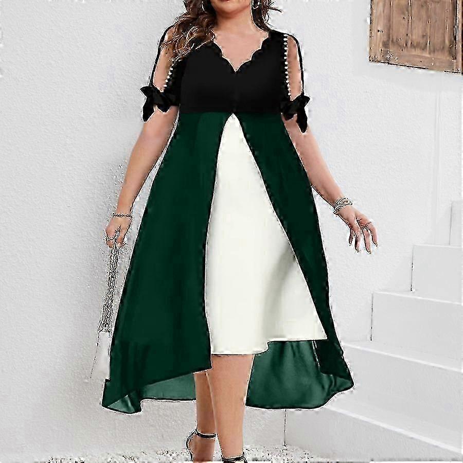 w Spring Summer Plus Size Women Clothes Elegant Fashion Off Shoulder V Neck Patchwork Chiffon Faux Two Piece Irregular Dress