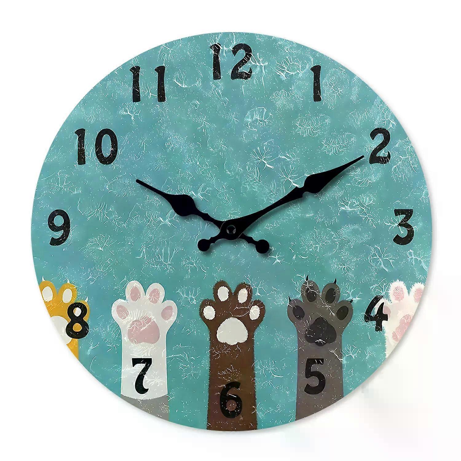 Cartoon Cute Cat Paw Print Oil Painting Pattern Wooden Wall Clock Living Room Bedroom Kitchen Home Decoration Wall Clock Silent Quartz Clock Holiday G