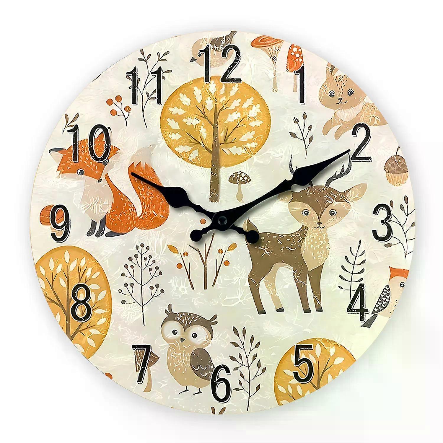 Cute Cartoon Forest Fox Deer Oil Painting Wooden Wall Clock Living Room Bedroom Kitchen Home Decoration Wall Clock Silent Quartz Clock Holiday Gift 10