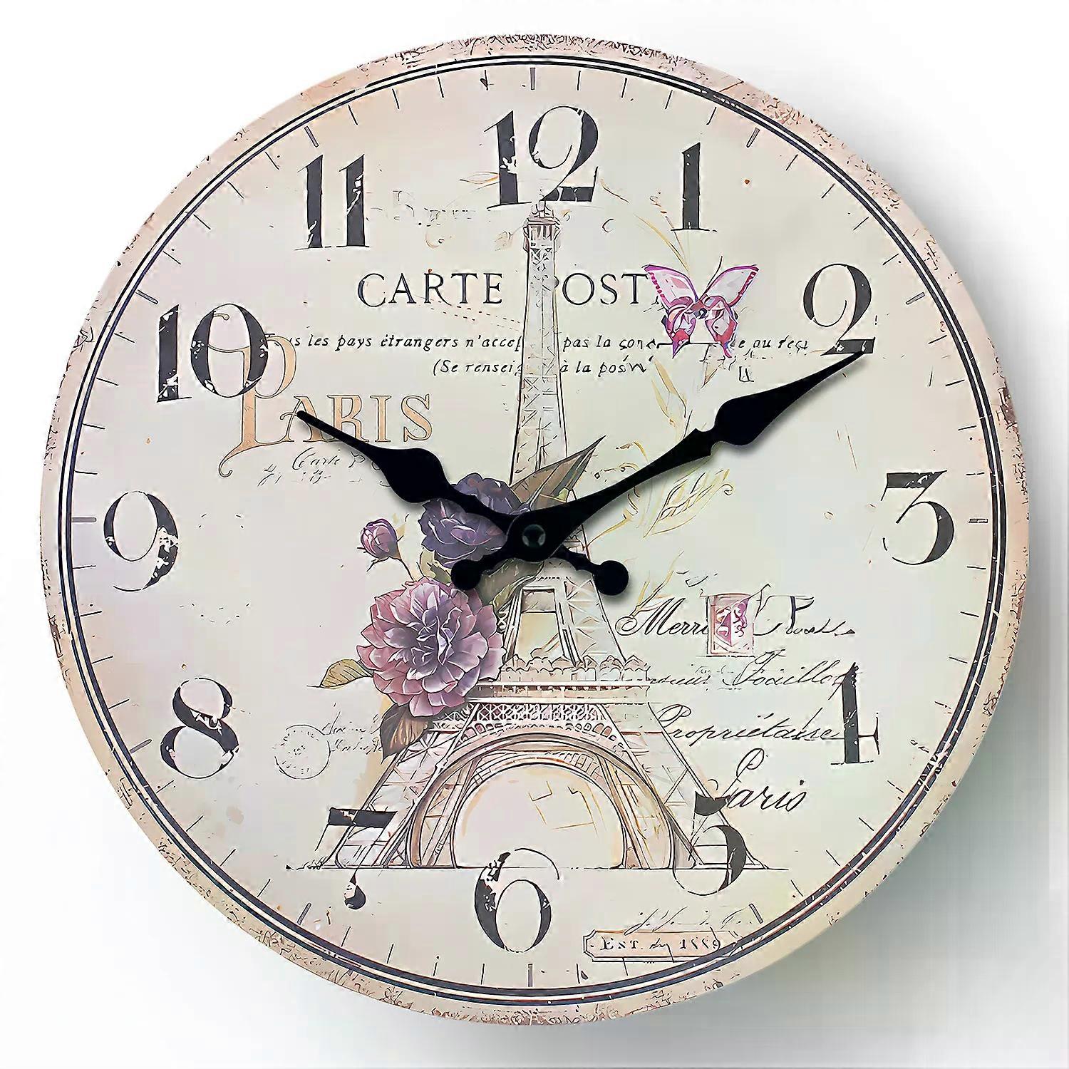French Paris Eiffel Tower Pattern Wooden Wall Clock Living Room Bedroom Kitchen Home Decoration Wall Clock Silent Quartz Clock Holiday Gift 10 Inches
